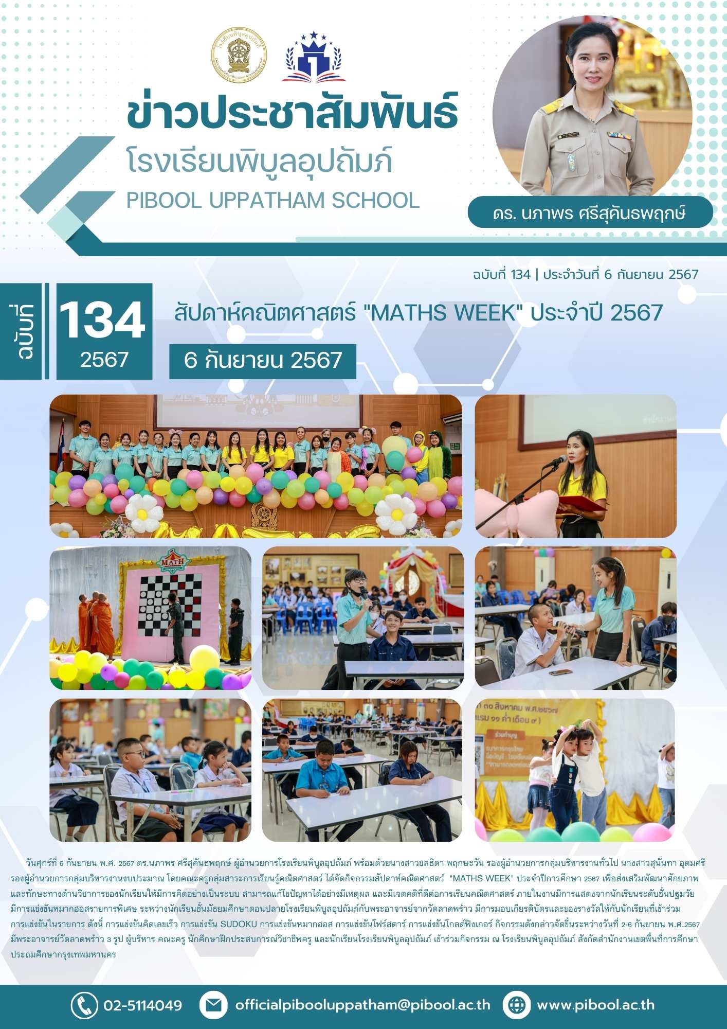 วันศุกร์ที่ 6 กันยายน พ.ศ. 2567 ดร.นภาพร ศรีสุคันธพฤกษ์ ผู้อำนวยการโรงเรียนพิบูลอุปถัมภ์ พร้อมด้วยนางสาวชลธิดา พฤกษะวัน รองผู้อำนวยการกลุ่มบริหารงานทั่วไป นางสาวสุนันทา อุดมศรี รองผู้อำนวยการกลุ่มบริหารงานงบประมาณ โดยคณะครูกลุ่มสาระการเรียนรู้คณิตศาสตร์ ได้จัดกิจกรรมสัปดาห์คณิตศาสตร์ "MATHS WEEK" ประจำปีการศึกษา 2567 เพื่อส่งเสริมพัฒนาศักยภาพ และทักษะทางด้านวิชาการของนักเรียนให้มีการคิดอย่างเป็นระบบ สามารถแก้ไขปัญหาได้อย่างมีเหตุผล และมีเจตคติที่ดีต่อการเรียนคณิตศาสตร์ ภายในงานมีการแสดงจากนักเรียนระดับชั้นปฐมวัย มีการแข่งขันหมากฮอสรายการพิเศษ ระหว่างนักเรียนชั้นมัธยมศึกษาตอนปลายโรงเรียนพิบูลอุปถัมภ์กับพระอาจารย์จากวัดลาดพร้าว มีการมอบเกียรติบัตรและของรางวัลให้กับนักเรียนที่เข้าร่วม การแข่งขันในรายการ ดังนี้ การแข่งขันคิดเลขเร็ว การแข่งขัน SUDOKU การแข่งขันหมากฮอส การแข่งขันโฟร์สตาร์ การแข่งขันโกลด์ฟิงเกอร์ กิจกรรมดังกล่าวจัดขึ้นระหว่างวันที่ 2-6 กันยายน พ.ศ.2567 มีพระอาจารย์วัดลาดพร้าว 3 รูป ผู้บริหาร คณะครู นักศึกษาฝึกประสบการณ์วิชาชีพครู และนักเรียนโรงเรียนพิบูลอุปถัมภ์ เข้าร่วมกิจกรรม ณ โรงเรียนพิบูลอุปถัมภ์ สังกัดสำนักงานเขตพื้นที่การศึกษาประถมศึกษากรุงเทพมหานคร
