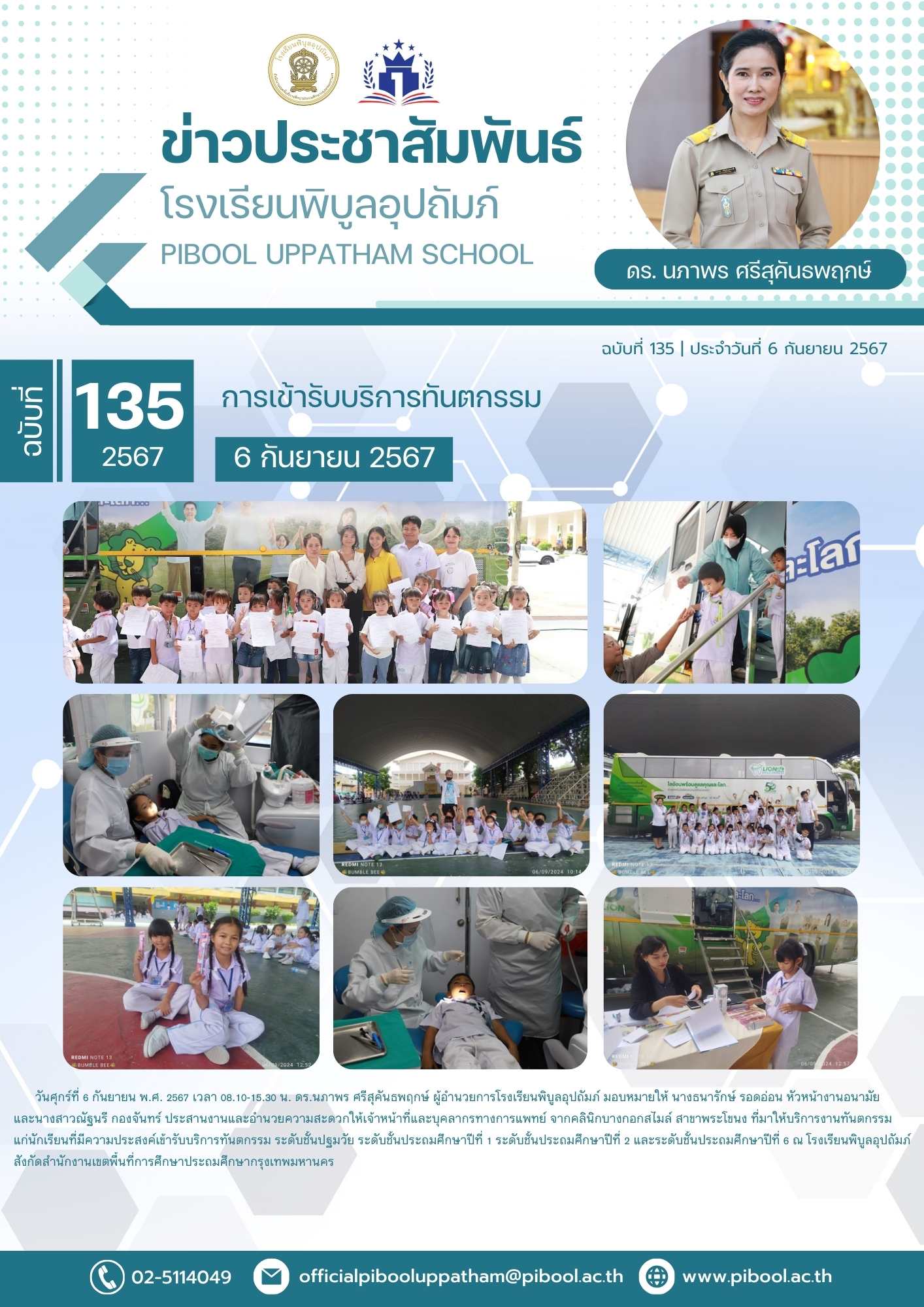 วันศุกร์ที่ 6 กันยายน พ.ศ. 2567 เวลา 08.10-15.30 น. ดร.นภาพร ศรีสุคันธพฤกษ์ ผู้อำนวยการโรงเรียนพิบูลอุปถัมภ์ มอบหมายให้ นางธนารักษ์ รอดอ่อน หัวหน้างานอนามัย และนางสาวณัฐนรี กองจันทร์ ประสานงานและอำนวยความสะดวกให้เจ้าหน้าที่และบุคลากรทางการแพทย์ จากคลินิกบางกอกสไมล์ สาขาพระโขนง ที่มาให้บริการงานทันตกรรม แก่นักเรียนที่มีความประสงค์เข้ารับบริการทันตกรรม ระดับชั้นปฐมวัย ระดับชั้นประถมศึกษาปีที่ 1 ระดับชั้นประถมศึกษาปีที่ 2 และระดับชั้นประถมศึกษาปีที่ 6 ณ โรงเรียนพิบูลอุปถัมภ์ สังกัดสำนักงานเขตพื้นที่การศึกษาประถมศึกษากรุงเทพมหานคร
