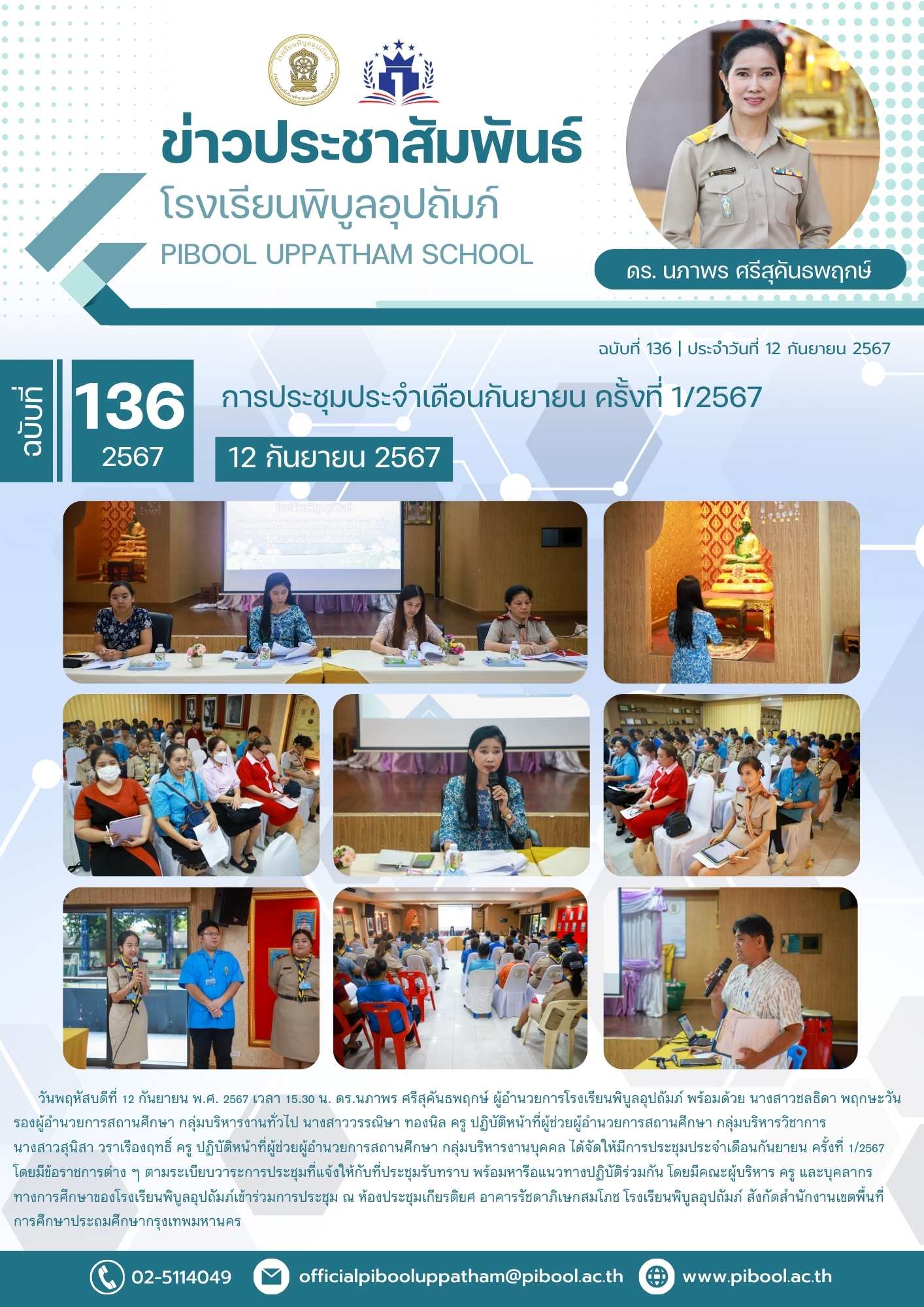 วันพฤหัสบดีที่ 12 กันยายน พ.ศ. 2567 เวลา 15.30 น. ดร.นภาพร ศรีสุคันธพฤกษ์ ผู้อำนวยการโรงเรียนพิบูลอุปถัมภ์ พร้อมด้วย นางสาวชลธิดา พฤกษะวัน รองผู้อำนวยการสถานศึกษา กลุ่มบริหารงานทั่วไป นางสาววรรณิษา ทองนิล ครู ปฏิบัติหน้าที่ผู้ช่วยผู้อำนวยการสถานศึกษา กลุ่มบริหารวิชาการ นางสาวสุนิสา วราเรืองฤทธิ์ ครู ปฏิบัติหน้าที่ผู้ช่วยผู้อำนวยการสถานศึกษา กลุ่มบริหารงานบุคคล ได้จัดให้มีการประชุมประจำเดือนกันยายน ครั้งที่ 1/2567 โดยมีข้อราชการต่าง ๆ ตามระเบียบวาระการประชุมที่แจ้งให้กับที่ประชุมรับทราบ พร้อมหารือแนวทางปฏิบัติร่วมกัน โดยมีคณะผู้บริหาร ครู และบุคลากรทางการศึกษาของโรงเรียนพิบูลอุปถัมภ์เข้าร่วมการประชุม ณ ห้องประชุมเกียรติยศ อาคารรัชดาภิเษกสมโภช โรงเรียนพิบูลอุปถัมภ์ สังกัดสำนักงานเขตพื้นที่ การศึกษาประถมศึกษากรุงเทพมหานคร |