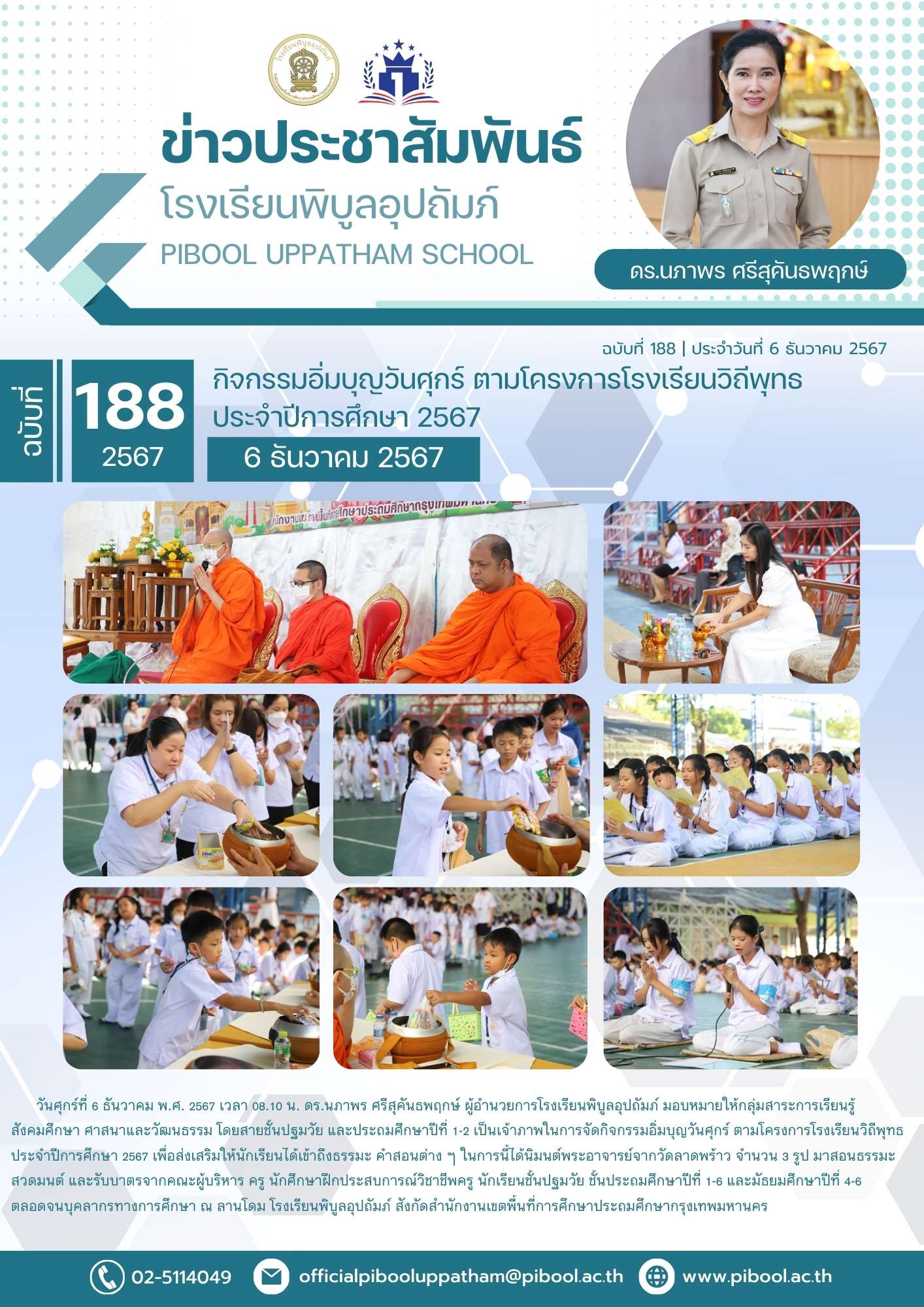 วันศุกร์ที่ 6 ธันวาคม พ.ศ. 2567 เวลา 08.10 น. ดร.นภาพร ศรีสุคันธพฤกษ์ ผู้อำนวยการโรงเรียนพิบูลอุปถัมภ์ มอบหมายให้กลุ่มสาระการเรียนรู้สังคมศึกษา ศาสนาและวัฒนธรรม โดยสายชั้นปฐมวัย และประถมศึกษาปีที่ 1-2 เป็นเจ้าภาพในการจัดกิจกรรมอิ่มบุญวันศุกร์ ตามโครงการโรงเรียนวิถีพุทธ ประจำปีการศึกษา 2567 เพื่อส่งเสริมให้นักเรียนได้เข้าถึงธรรมะ คำสอนต่าง ๆ ในการนี้ได้นิมนต์พระอาจารย์จากวัดลาดพร้าว จำนวน 3 รูป มาสอนธรรมะ สวดมนต์ และรับบาตรจากคณะผู้บริหาร ครู นักศึกษาฝึกประสบการณ์วิชาชีพครู นักเรียนชั้นปฐมวัย ชั้นประถมศึกษาปีที่ 1-6 และมัธยมศึกษาปีที่ 4-6