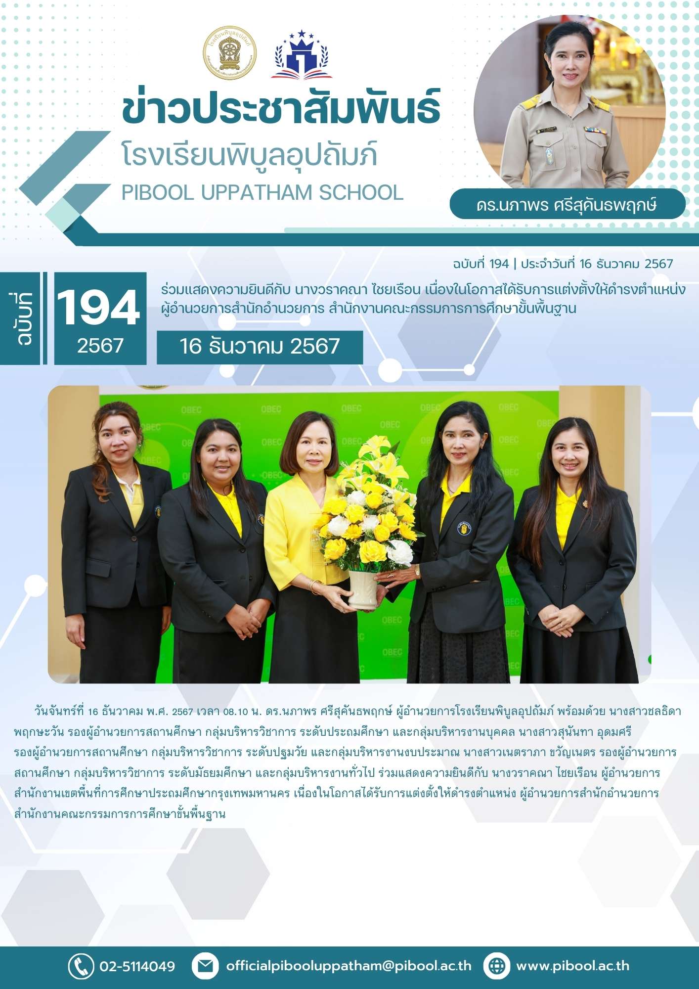 ข่าวประชาสัมพันธ์ ฉบับที่ 194/2567 ร่วมแสดงความยินดีกับ นางวราคณา ไชยเรือน เนื่องในโอกาสได้รับการแต่งตั้งให้ดำรงตำแหน่ง ผู้อำนวยการสำนักอำนวยการ สำนักงานคณะกรรมการการศึกษาขั้นพื้นฐาน