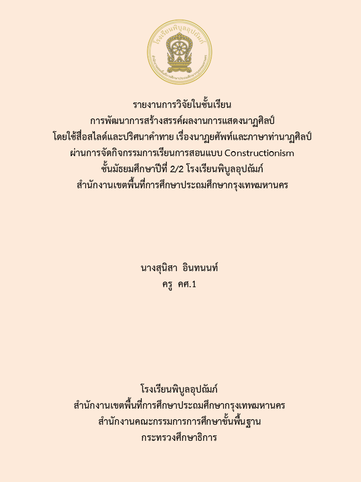 ชื่อผลงาน : การพัฒนาการสร้างสรรค์ผลงานการแสดงนาฏศิลป์ โดยใช้สื่อสไลด์และปริศนาคำทาย เรื่องนาฏยศัพท์และภาษาท่านาฏศิลป์ ผ่านการจัดกิจกรรมการเรียนการสอนแบบ Constructionism ชั้นมัธยมศึกษาปีที่ 2/2 โรงเรียนพิบูลอุปถัมภ์