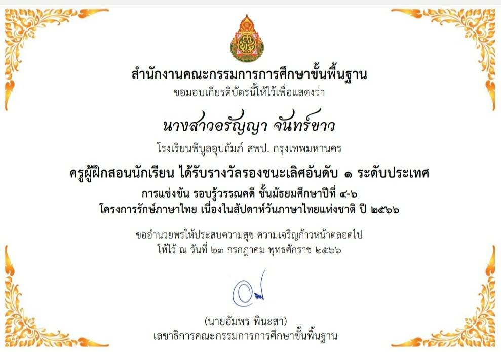 ชื่อผลงาน : ครูผู้สอนนักเรียนได้รับรางวัลรองชนะเลิศอันดับ 1 ระดับประเทศ การแข่งขันรอบรู้วรรณคดี ระดับชั้นมัธยมศึกษาปีที่ 4 – 6 โครงการรักษ์ภาษาไทย เนื่องในสัปดาห์วันภาษาไทยแห่งชาติ ประจำปี 2566 สำนักงานคณะกรรมการการศึกษาขั้นพื้นฐาน วันที่ 23 กรกฎาคม 2566