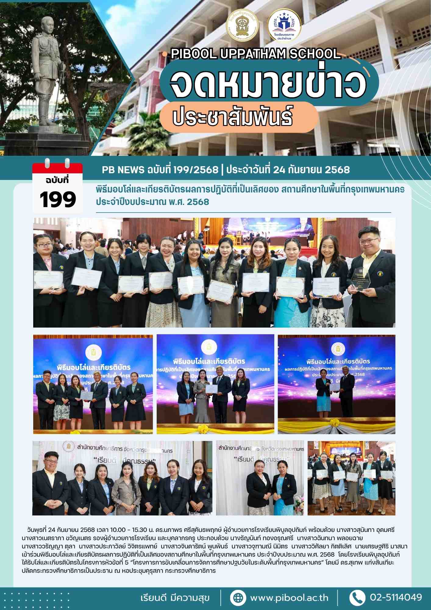 นางสาววรัญญา ตุลา นางสาวประภาวัลย์ วิจิตรแพทย์ นางสาวจินดารัตน์ พูนพันธ์ นางสาวจุฑามณี นิมิตร นางสาววิศัลยา กิตติเลิศ นายเศรษฐศิริ มาสนา เข้าร่วมพิธีมอบโล่และเกียรติบัตรผลการปฏิบัติที่เป็นเลิศของสถานศึกษาในพื้นที่กรุงเทพมหานคร ประจำปีงบประมาณ พ.ศ. 2568 โดยโรงเรียนพิบูลอุปถัมภ์