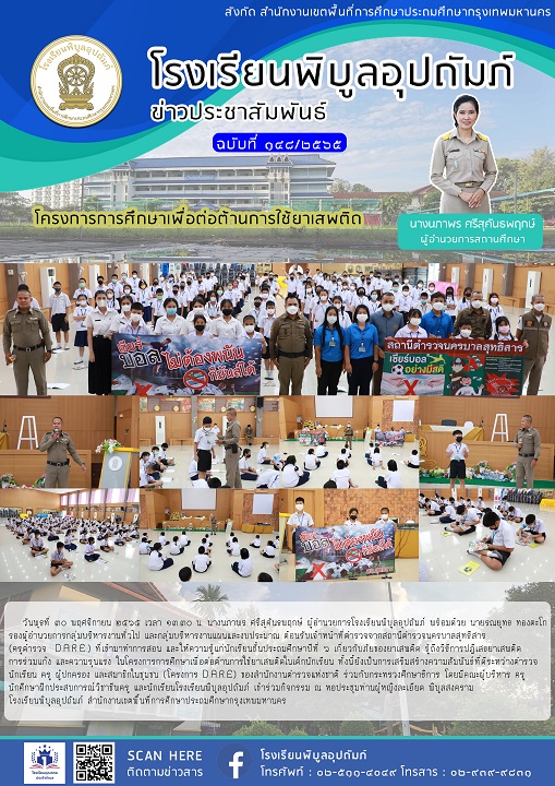 จดหมายข่าวฉบับที่ 148/2565 ให้ความรู้แก่นักเรียนชั้นประถมศึกษาปีที่ ๖ เกี่ยวกับภัยของยาเสพติด รู้ถึงวิธีการปฏิเสธยาเสพติด การร่วมแก๊ง และความรุ่นแรง ในโครงการการศึกษาเพื่อต่อต้านการใช้ยาเสพติดในเด็กนักเรียน (30/11/2565)