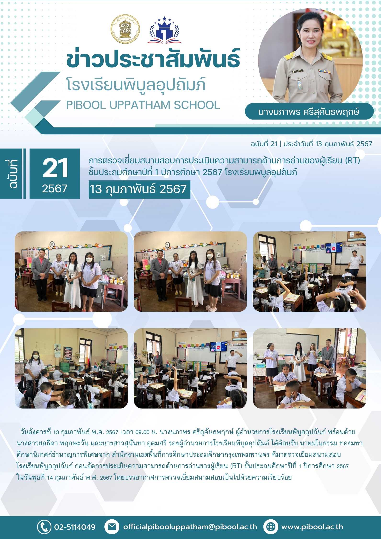 ข่าวประชาสัมพันธ์ ฉบับที่ 21/2567 การตรวจเยี่ยมสนามสอบการประเมินความสามารถด้านการอ่านของผู้เรียน (RT) ชั้นประถมศึกษาปีที่ 1 ปีการศึกษา 2567 โรงเรียนพิบูลอุปถัมภ์