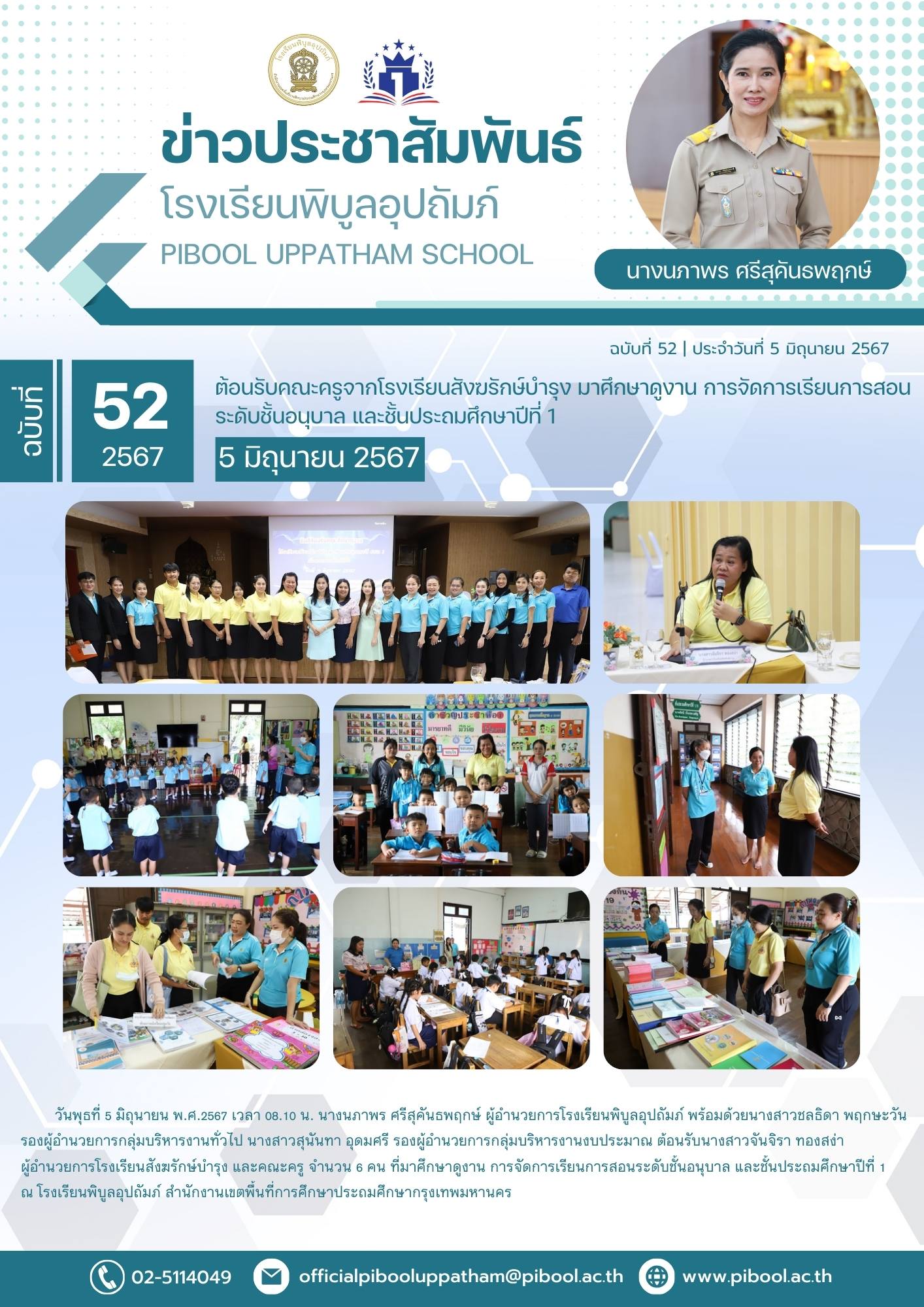 วันพุธที่ 5 มิถุนายน พ.ศ.2567 เวลา 08.10 น. นางนภาพร ศรีสุคันธพฤกษ์ ผู้อำนวยการโรงเรียนพิบูลอุปถัมภ์ พร้อมด้วยนางสาวชลธิดา พฤกษะวันรองผู้อำนวยการกลุ่มบริหารงานทั่วไป นางสาวสุนันทา อุดมศรี รองผู้อำนวยการกลุ่มบริหารงานงบประมาณ ต้อนรับนางสาวจันจิรา ทองสง่าผู้อำนวยการโรงเรียนสังฆรักษ์บำรุง และคณะครู จำนวน 6 คน ที่มาศึกษาดูงาน การจัดการเรียนการสอนระดับชั้นอนุบาล และชั้นประถมศึกษาปีที่ 1ณ โรงเรียนพิบูลอุปถัมภ์ สำนักงานเขตพื้นที่การศึกษาประถมศึกษากรุงเทพมหานคร