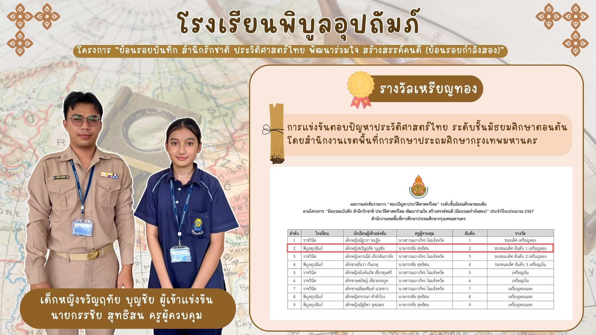 โรงเรียนพิบูลอุปถัมภ์ขอแสดงความยินดีกับ เด็กหญิงขวัญฤทัย บุญชัย ในการแข่งขันรายการตอบปัญหาประวัติศาสตร์ไทย ระดับชั้นมัธยมศึกษาตอนต้น