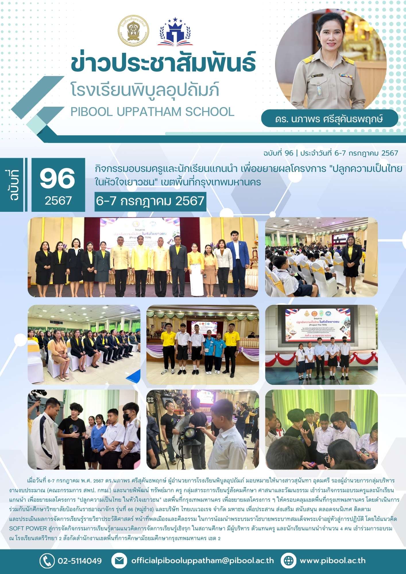 เมื่อวันที่ 6-7 กรกฎาคม พ.ศ. 2567 ดร.นภาพร ศรีสุคันธพฤกษ์ ผู้อำนวยการโรงเรียนพิบูลอุปถัมภ์ มอบหมายให้นางสาวสุนันทา อุดมศรี รองผู้อำนวยการกลุ่มบริหารงานงบประมาณ (คณะกรรมการ สพป. กทม.) และนายพิพัฒน์ ทรัพย์มาก ครู กลุ่มสาระการเรียนรู้สังคมศึกษา ศาสนาและวัฒนธรรม เข้าร่วมกิจกรรมอบรมครูและนักเรียนแกนนำ เพื่อขยายผลโครงการ "ปลูกความเป็นไทย ในหัวใจเยาวชน" เขตพื้นที่กรุงเทพมหานคร เพื่อขยายผลโครงการ ฯ ให้ครอบคลุมเขตพื้นที่กรุงเทพมหานคร โดยดำเนินการร่วมกับนักศึกษาวิทยาลัยป้องกันราชอาณาจักร รุ่นที่ 66 (หมู่ช้าง) และบริษัท ไทยเบเวอเรจ จำกัด มหาชน เพื่อประสาน ส่งเสริม สนับสนุน ตลอดจนนิเทศ ติดตาม และประเมินผลการจัดการเรียนรู้รายวิชาประวัติศาสตร์ หน้าที่พลเมืองและศีลธรรม ในการน้อมนำพระบรมราโชบายพระบาทสมเด็จพระเจ้าอยู่หัวสู่การปฏิบัติ โดยใช้แนวคิด Soft Power สู่การจัดกิจกรรมการเรียนรู้ตามแนวคิดการจัดการเรียนรู้เชิงรุก ในสถานศึกษา มีผู้บริหาร ตัวแทนครู และนักเรียนแกนนำจำนวน 4 คน เข้าร่วมการอบรม ณ โรงเรียนสตรีวิทยา 2 สังกัดสำนักงานเขตพื้นที่การศึกษามัธยมศึกษากรุงเทพมหานคร เขต 2