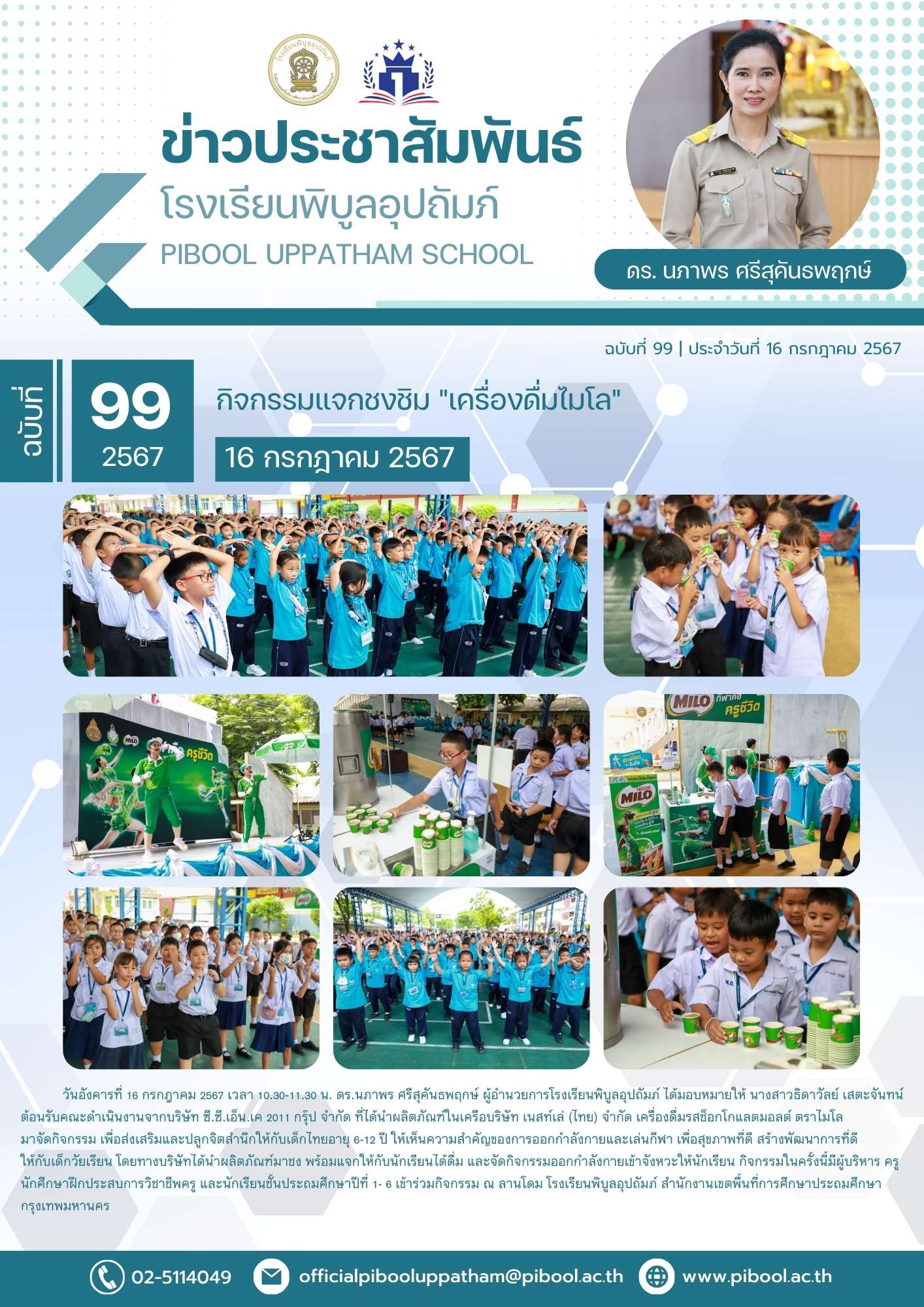 วันอังคารที่ 16 กรกฎาคม 2567 เวลา 10.30-11.30 น. ดร.นภาพร ศรีสุคันธพฤกษ์ ผู้อำนวยการโรงเรียนพิบูลอุปถัมภ์ ได้มอบหมายให้ นางสาวธิดาวัลย์ เสตะจันทน์ ต้อนรับคณะดำเนินงานจากบริษัท ซี.ซี.เอ็น.เค 2011 กรุ๊ป จำกัด ที่ได้นำผลิตภัณฑ์ในเครือบริษัท เนสท์เล่ (ไทย) จำกัด เครื่องดื่มรสช็อกโกแลตมอลต์ ตราไมโล มาจัดกิจกรรม เพื่อส่งเสริมและปลูกจิตสำนึกให้กับเด็กไทยอายุ 6-12 ปี ให้เห็นความสำคัญของการออกกำลังกายและเล่นกีฬา เพื่อสุขภาพที่ดี สร้างพัฒนาการที่ดี ให้กับเด็กวัยเรียน โดยทางบริษัทได้นำผลิตภัณฑ์มาชง พร้อมแจกให้กับนักเรียนได้ดื่ม และจัดกิจกรรมออกกำลังกายเข้าจังหวะให้นักเรียน กิจกรรมในครั้งนี้มีผู้บริหาร ครู นักศึกษาฝึกประสบการวิชาชีพครู และนักเรียนชั้นประถมศึกษาปีที่ 1- 6 เข้าร่วมกิจกรรม ณ ลานโดม โรงเรียนพิบูลอุปถัมภ์ สำนักงานเขตพื้นที่การศึกษาประถมศึกษากรุงเทพมหานคร