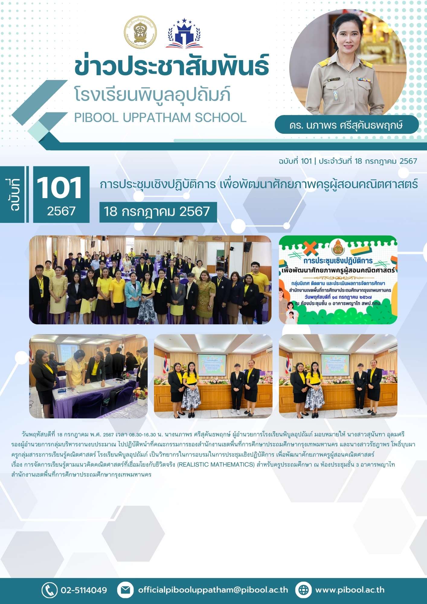 วันพฤหัสบดีที่ 18 กรกฎาคม พ.ศ. 2567 เวลา 08.30-16.30 น. นางนภาพร ศรีสุคันธพฤกษ์ ผู้อำนวยการโรงเรียนพิบูลอุปถัมภ์ มอบหมายให้ นางสาวสุนันทา อุดมศรี รองผู้อำนวยการกลุ่มบริหารงานงบประมาณ ไปปฏิบัติหน้าที่คณะกรรมการของสำนักงานเขตพื้นที่การศึกษาประถมศึกษากรุงเทพมหานคร และนางสาวรัชฎาพร โพธิ์บุบผา ครูกลุ่มสาระการเรียนรู้คณิตศาสตร์ โรงเรียนพิบูลอุปถัมภ์ เป็นวิทยากรในการอบรมในการประชุมเชิงปฏิบัติการ เพื่อพัฒนาศักยภาพครูผู้สอนคณิตศาสตร์ เรื่อง การจัดการเรียนรู้ตามแนวคิดคณิตศาสตร์ที่เชื่อมโยงกับชีวิตจริง (Realistic Mathematics) สำหรับครูประถมศึกษา ณ ห้องประชุมชั้น 3 อาคารพญาไท สำนักงานเขตพื้นที่การศึกษาประถมศึกษากรุงเทพมหานคร