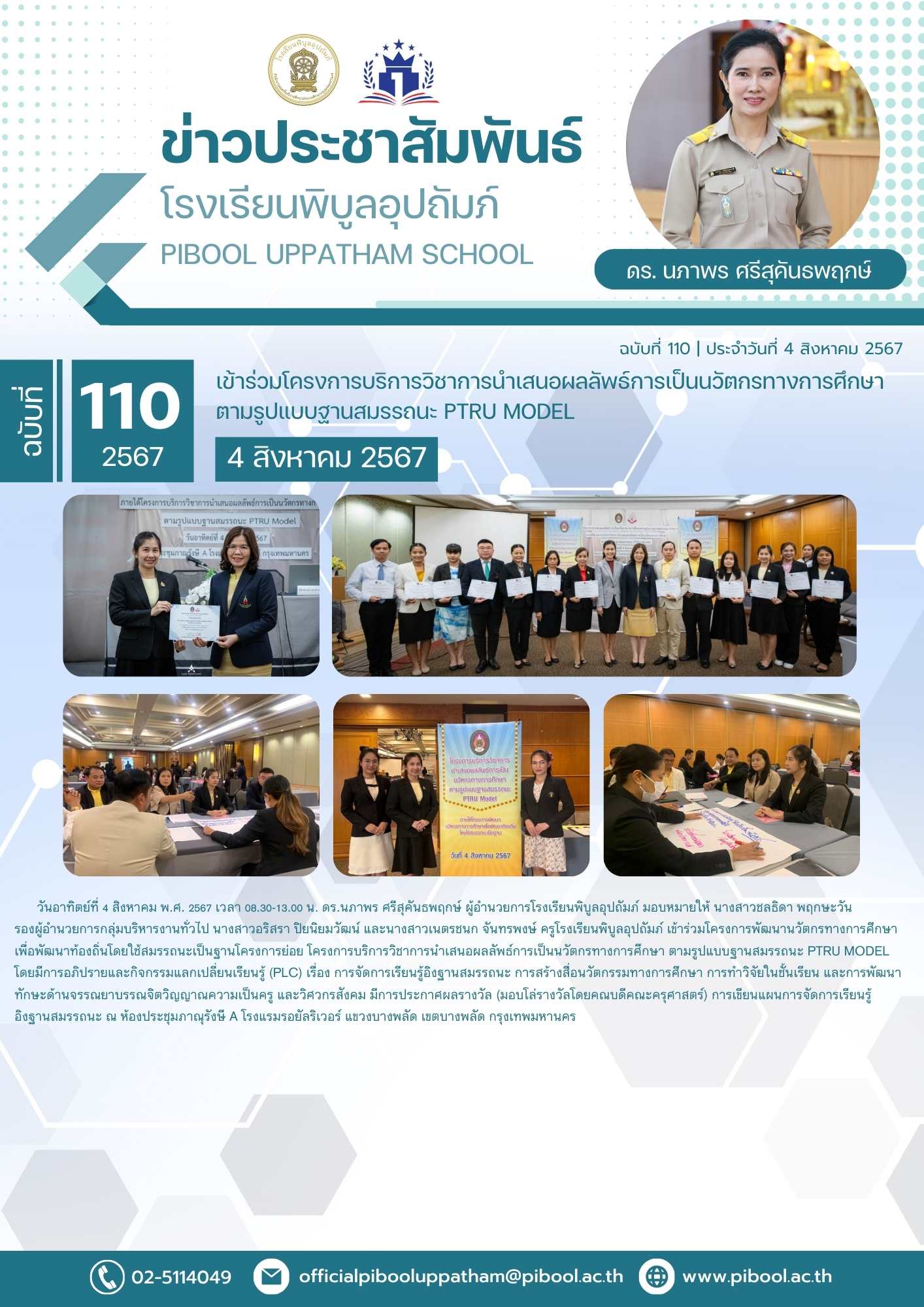 วันอาทิตย์ที่ 4 สิงหาคม พ.ศ. 2567 เวลา 08.30-13.00 น. ดร.นภาพร ศรีสุคันธพฤกษ์ ผู้อำนวยการโรงเรียนพิบูลอุปถัมภ์ มอบหมายให้ นางสาวชลธิดา พฤกษะวัน รองผู้อำนวยการกลุ่มบริหารงานทั่วไป นางสาวอริสรา ปิยนิยมวัฒน์ และนางสาวเนตรชนก จันทรพงษ์ ครูโรงเรียนพิบูลอุปถัมภ์ เข้าร่วมโครงการพัฒนานวัตกรทางการศึกษา เพื่อพัฒนาท้องถิ่นโดยใช้สมรรถนะเป็นฐานโครงการย่อย โครงการบริการวิชาการนำเสนอผลลัพธ์การเป็นนวัตกรทางการศึกษา ตามรูปแบบฐานสมรรถนะ PTRU Model โดยมีการอภิปรายและกิจกรรมแลกเปลี่ยนเรียนรู้ (PLC) เรื่อง การจัดการเรียนรู้อิงฐานสมรรถนะ การสร้างสื่อนวัตกรรมทางการศึกษา การทำวิจัยในชั้นเรียน และการพัฒนาทักษะด้านจรรณยาบรรณจิตวิญญาณความเป็นครู และวิศวกรสังคม มีการประกาศผลรางวัล (มอบโล่รางวัลโดยคณบดีคณะครุศาสตร์) การเขียนแผนการจัดการเรียนรู้อิงฐานสมรรถนะ ณ ห้องประชุมภาณุรังษี A โรงแรมรอยัลริเวอร์ แขวงบางพลัด เขตบางพลัด กรุงเทพมหานคร