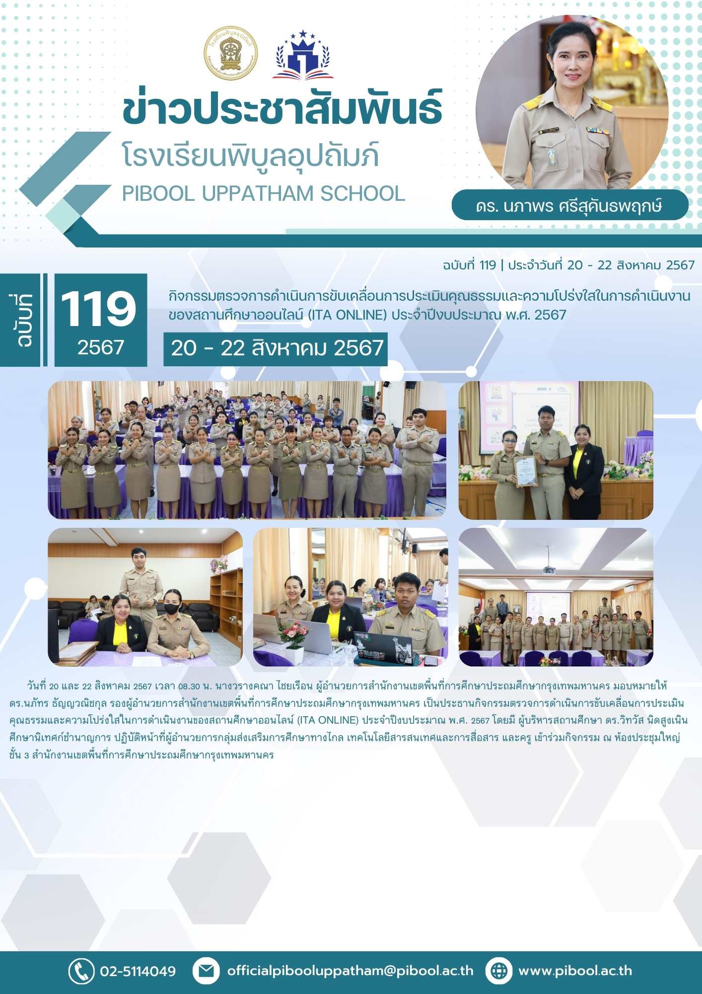 ข่าวประชาสัมพันธ์ ฉบับที่ 119/2567 กิจกรรมตรวจการดำเนินการขับเคลื่อนการประเมินคุณธรรมและความโปร่งใสในการดำเนินงาน ของสถานศึกษาออนไลน์ (ITA Online) ประจำปีงบประมาณ พ.ศ. 2567