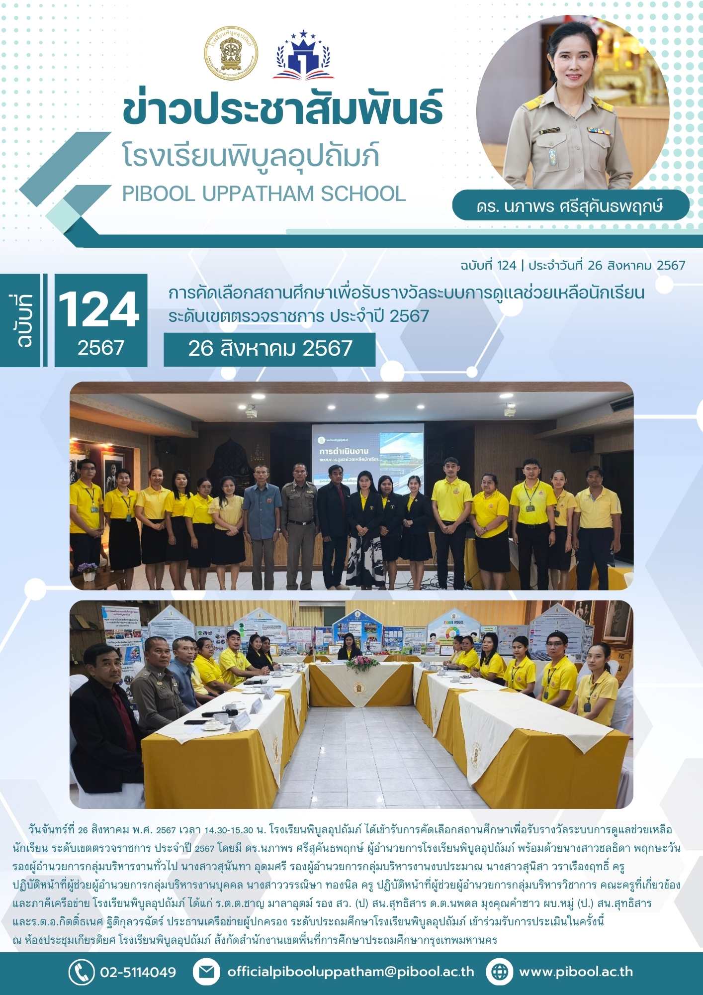 วัันจันทร์ที่ 26 สิงหาคม พ.ศ. 2567 เวลา 14.30-15.30 น. โรงเรียนพิบูลอุปถัมภ์ ได้เข้ารับการคัดเลือกสถานศึกษาเพื่อรับรางวัลระบบการดูแลช่วยเหลือนักเรียน ระดับเขตตรวจราชการ ประจำปี 2567 โดยมี ดร.นภาพร ศรีสุคันธพฤกษ์ ผู้อำนวยการโรงเรียนพิบูลอุปถัมภ์ พร้อมด้วยนางสาวชลธิดา พฤกษะวัน รองผู้อำนวยการกลุ่มบริหารงานทั่วไป นางสาวสุนันทา อุดมศรี รองผู้อำนวยการกลุ่มบริหารงานงบประมาณ นางสาวสุนิสา วราเรืองฤทธิ์ ครูปฏิบัติหน้าที่ผู้ช่วยผู้อำนวยการกลุ่มบริหารงานบุคคล นางสาววรรณิษา ทองนิล ครู ปฏิบัติหน้าที่ผู้ช่วยผู้อำนวยการกลุ่มบริหารวิชาการ คณะครูที่เกี่ยวข้อง และภาคีเครือข่าย โรงเรียนพิบูลอุปถัมภ์ ได้แก่ ร.ต.ต.ชาญ มาลาอุตม์ รอง สว. (ป) สน.สุทธิสาร ด.ต.นพดล มุงคุณคำซาว ผบ.หมู่ (ป.) สน.สุทธิสาร และร.ต.อ.กิตติ์ธเนศ ฐิติกุลวรฉัตร์ ประธานเครือข่ายผู้ปกครอง ระดับประถมศึกษาโรงเรียนพิบูลอุปถัมภ์ เข้าร่วมรับการประเมินในครั้งนี้ ณ ห้องประชุมเกียรติยศ โรงเรียนพิบูลอุปถัมภ์ สังกัดสำนักงานเขตพื้นที่การศึกษาประถมศึกษากรุงเทพมหานคร