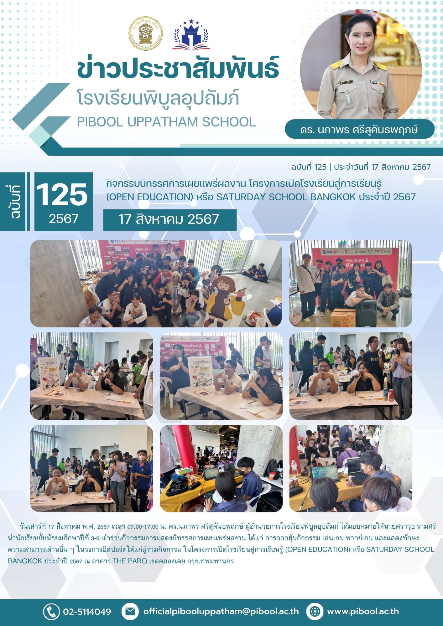 วันเสาร์ที่ 17 สิงหาคม พ.ศ. 2567 เวลา 07.00-17.00 น. ดร.นภาพร ศรีสุคันธพฤกษ์ ผู้อำนวยการโรงเรียนพิบูลอุปถัมภ์ ได้มอบหมายให้นายศราวุธ รามศรี นำนักเรียนชั้นมัธยมศึกษาปีที่ 3-6 เข้าร่วมกิจกรรมการแสดงนิทรรศการเผยแพร่ผลงาน ได้แก่ การออกซุ้มกิจกรรม เล่นเกม พากย์เกม และแสดงทักษะความสามารถด้านอื่น ๆ ในวงการอีสปอร์ตให้แก่ผู้ร่วมกิจกรรม ในโครงการเปิดโรงเรียนสู่การเรียนรู้ (Open Education) หรือ Saturday School Bangkok ประจำปี 2567 ณ อาคาร The PARQ เขตคลองเตย กรุงเทพมหานคร