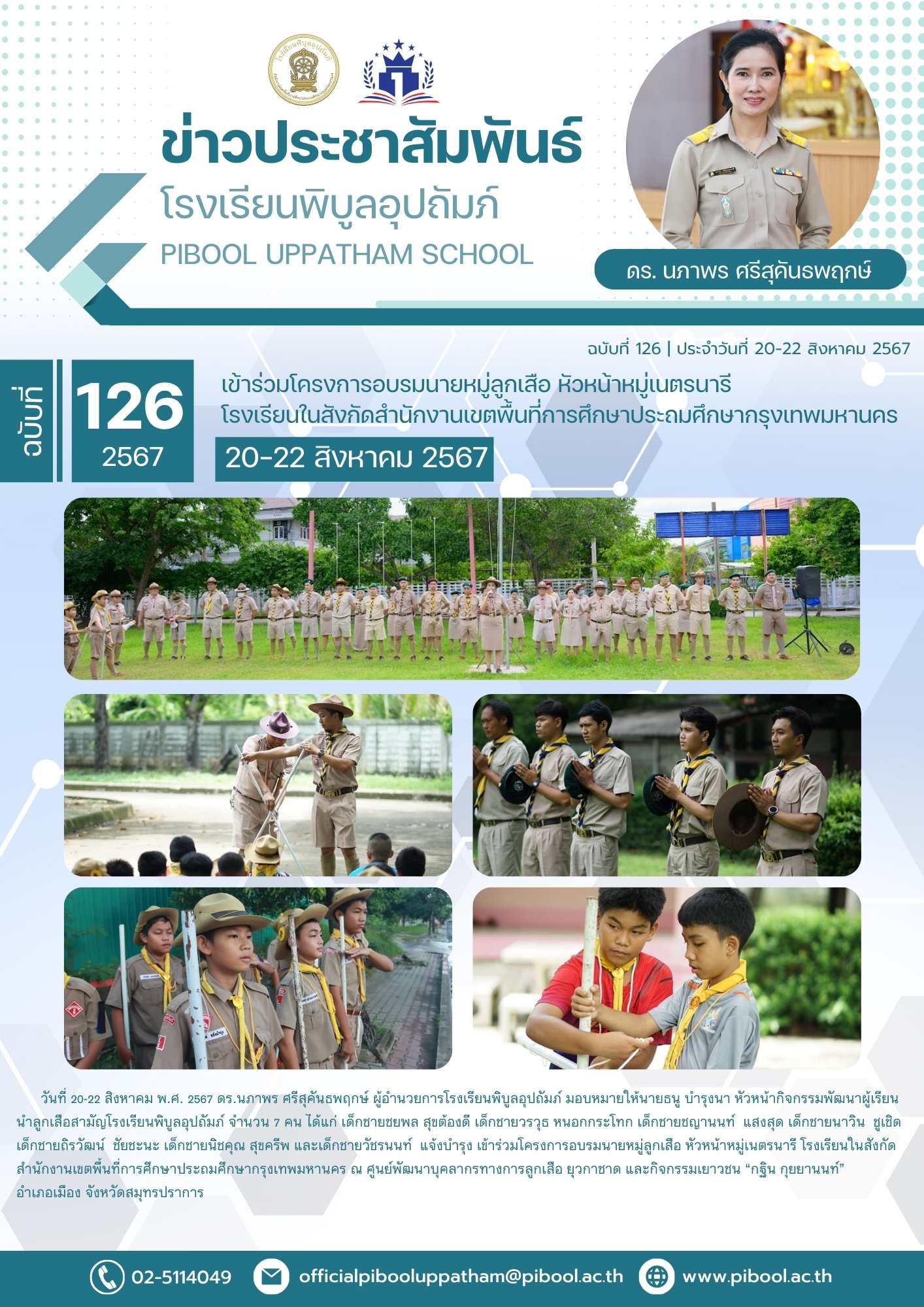 วันที่ 20-22 สิงหาคม พ.ศ. 2567 ดร.นภาพร ศรีสุคันธพฤกษ์ ผู้อำนวยการโรงเรียนพิบูลอุปถัมภ์ มอบหมายให้นายธนู บำรุงนา หัวหน้ากิจกรรมพัฒนาผู้เรียน นำลูกเสือสามัญโรงเรียนพิบูลอุปถัมภ์ จำนวน 7 คน ได้แก่ เด็กชายชยพล สุขต้องดี เด็กชายวรวุธ หนอกกระโทก เด็กชายชญานนท์ แสงสุด เด็กชายนาวิน ชูเชิด เด็กชายถิรวัฒน์ ชัยชะนะ เด็กชายนิชคุณ สุขครีพ และเด็กชายวัชรนนท์ แจ้งบำรุง เข้าร่วมโครงการอบรมนายหมู่ลูกเสือ หัวหน้าหมู่เนตรนารี โรงเรียนในสังกัดสำนักงานเขตพื้นที่การศึกษาประถมศึกษากรุงเทพมหานคร ณ ศูนย์พัฒนาบุคลากรทางการลูกเสือ ยุวกาชาด และกิจกรรมเยาวชน “กฐิน กุยยานนท์” อำเภอเมือง จังหวัดสมุทรปราการ |