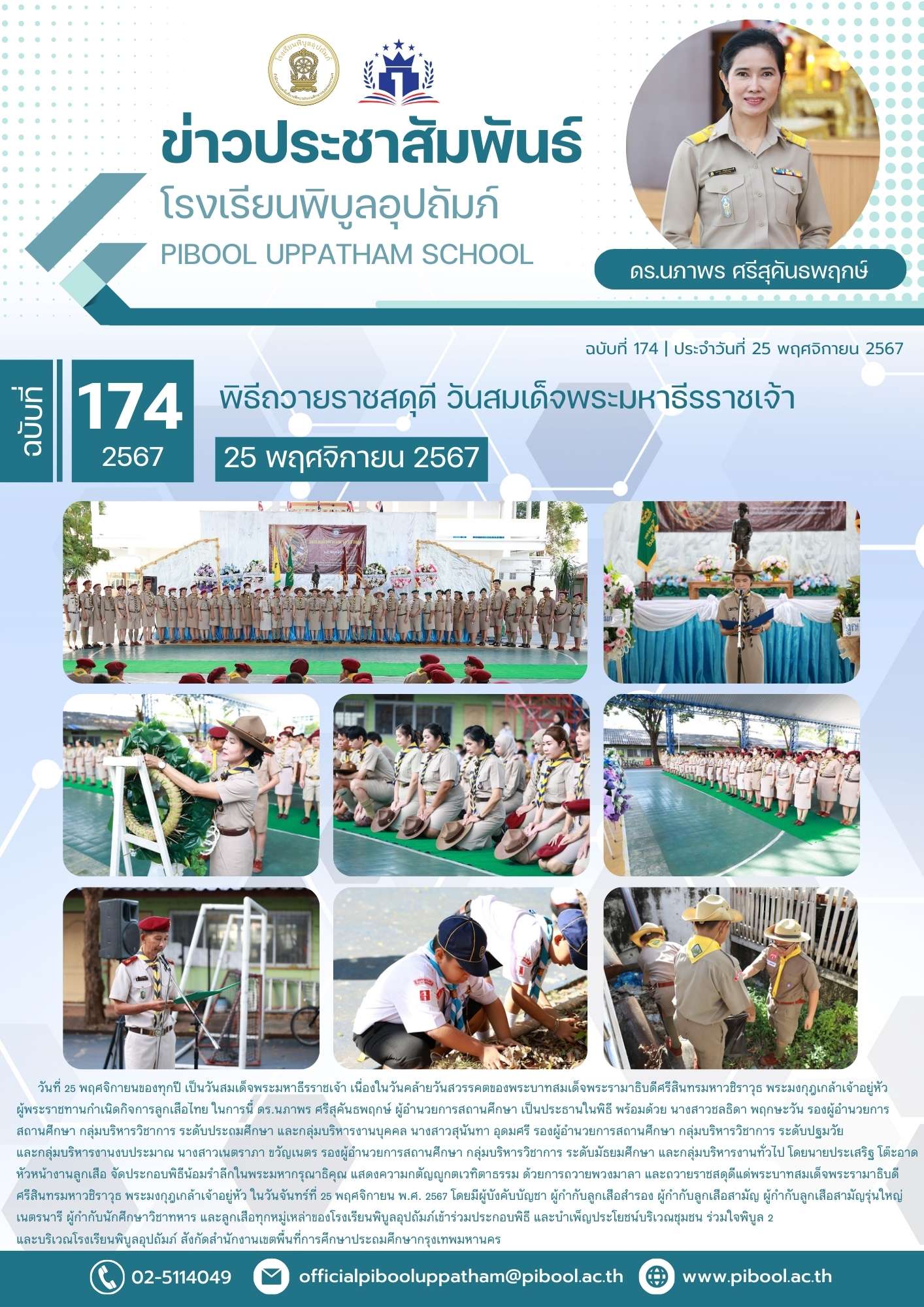 ศรีสินทรมหาวชิราวุธ พระมงกุฎเกล้าเจ้าอยู่หัว ในวันจันทร์ที่ 25 พฤศจิกายน พ.ศ. 2567 โดยมีผู้บังคับบัญชา ผู้กำกับลูกเสือสำรอง ผู้กำกับลูกเสือสามัญ ผู้กำกับลูกเสือสามัญรุ่นใหญ่ เนตรนารี ผู้กำกับนักศึกษาวิชาทหาร และลูกเสือทุกหมู่เหล่าของโรงเรียนพิบูลอุปถัมภ์เข้าร่วมประกอบพิธี และบำเพ็ญประโยชน์บริเวณชุมชน ร่วมใจพิบูล 2