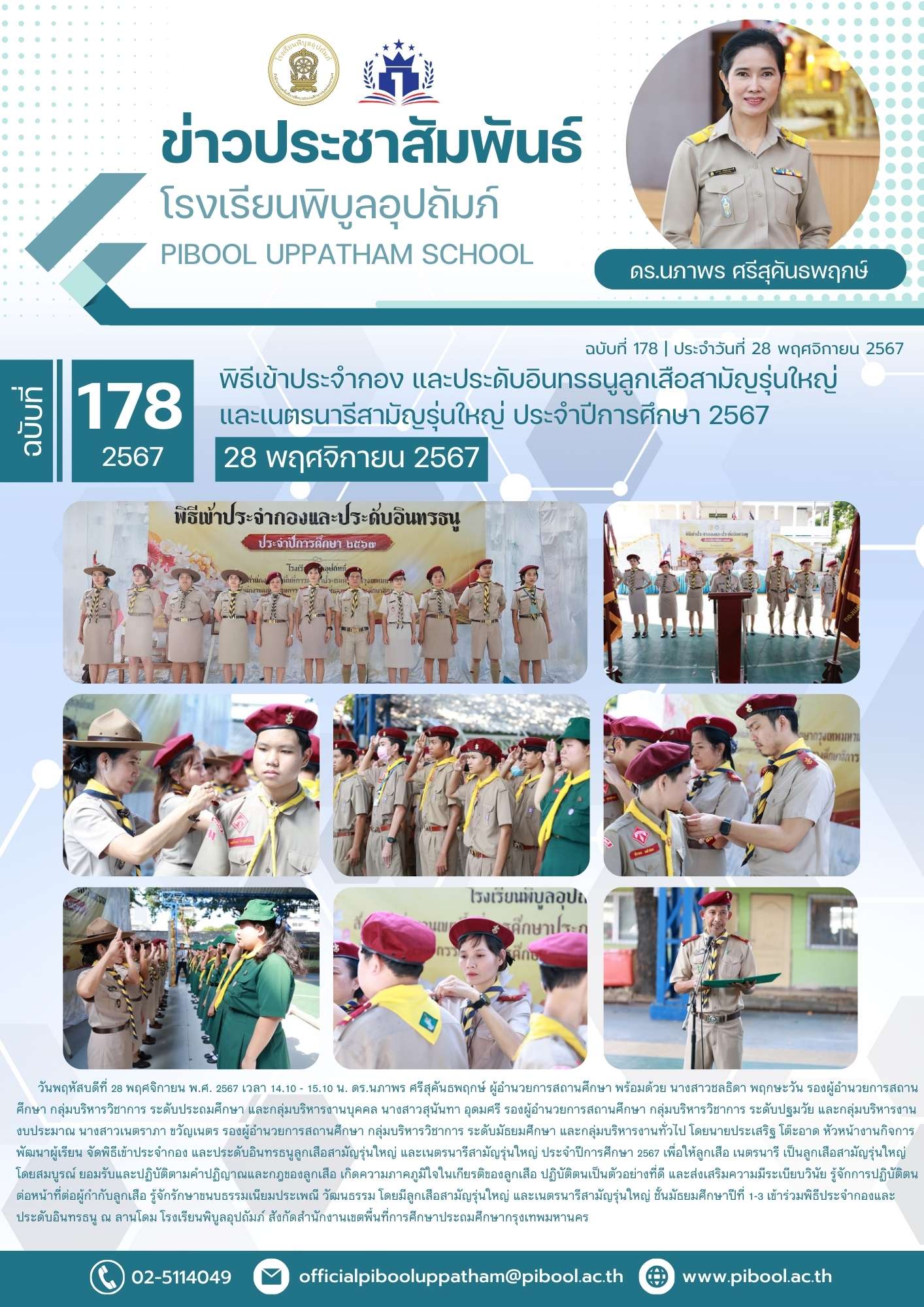 ข่าวประชาสัมพันธ์ ฉบับที่ 178/2567 พิธีเข้าประจำกอง และประดับอินทรธนูลูกเสือสามัญรุ่นใหญ่ และเนตรนารีสามัญรุ่นใหญ่ ประจำปีการศึกษา 2567