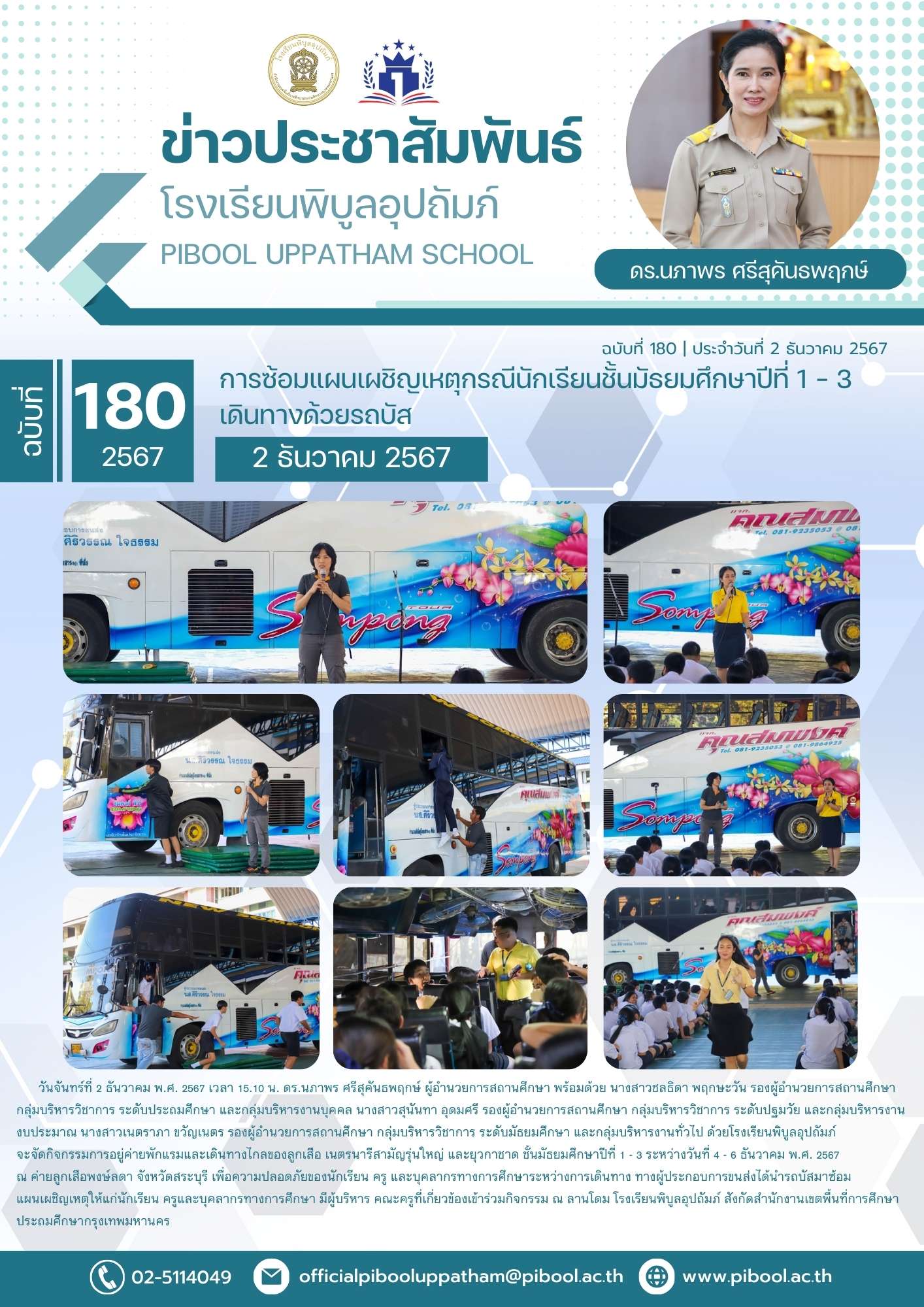 ข่าวประชาสัมพันธ์ ฉบับที่ 180/2567 การซ้อมแผนเผชิญเหตุกรณีนักเรียนชั้นมัธยมศึกษาปีที่ 1 - 3 เดินทางด้วยรถบัส