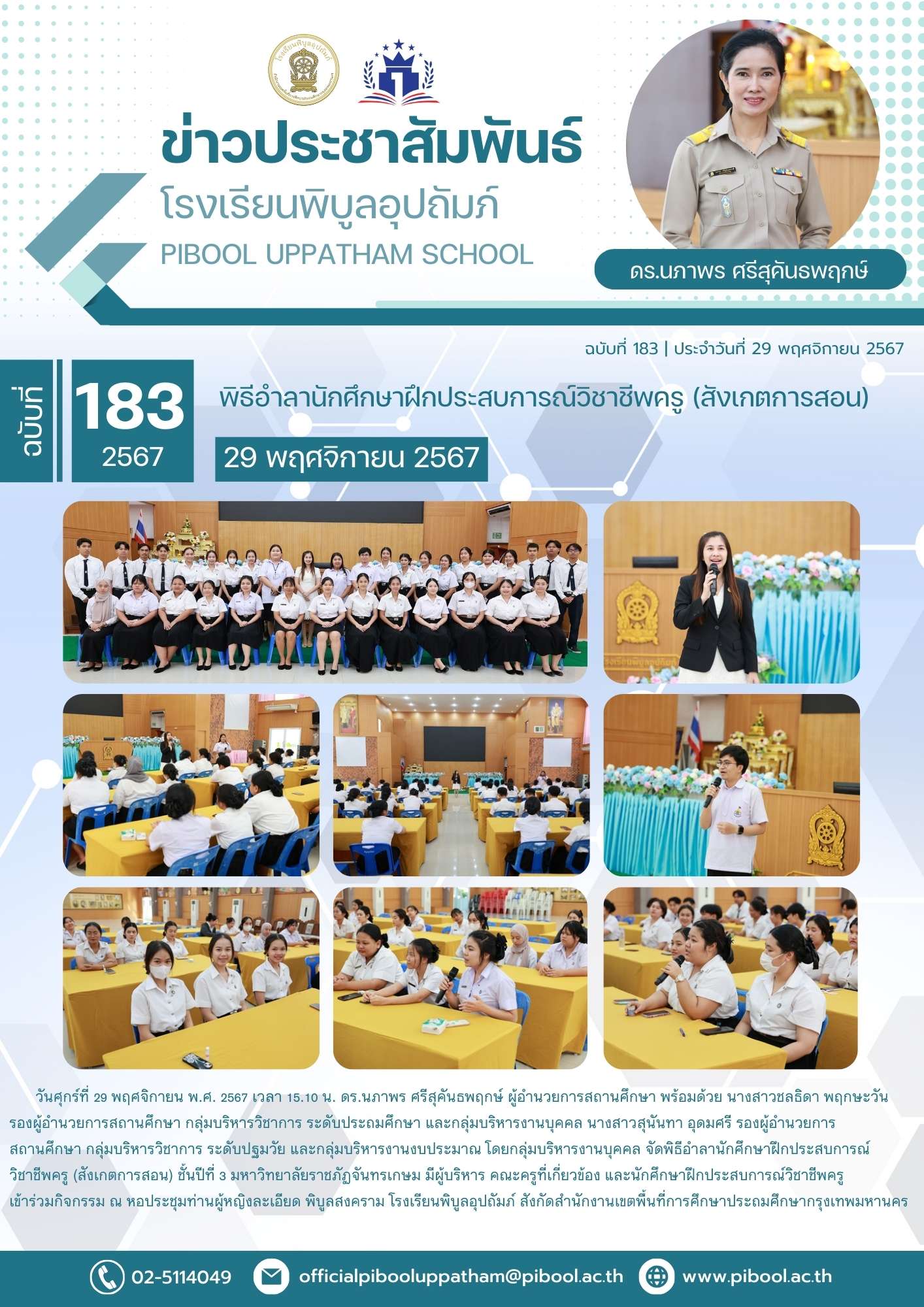 ข่าวประชาสัมพันธ์ ฉบับที่ 183/2567 พิธีอำลานักศึกษาฝึกประสบการณ์วิชาชีพครู (สังเกตการสอน)
