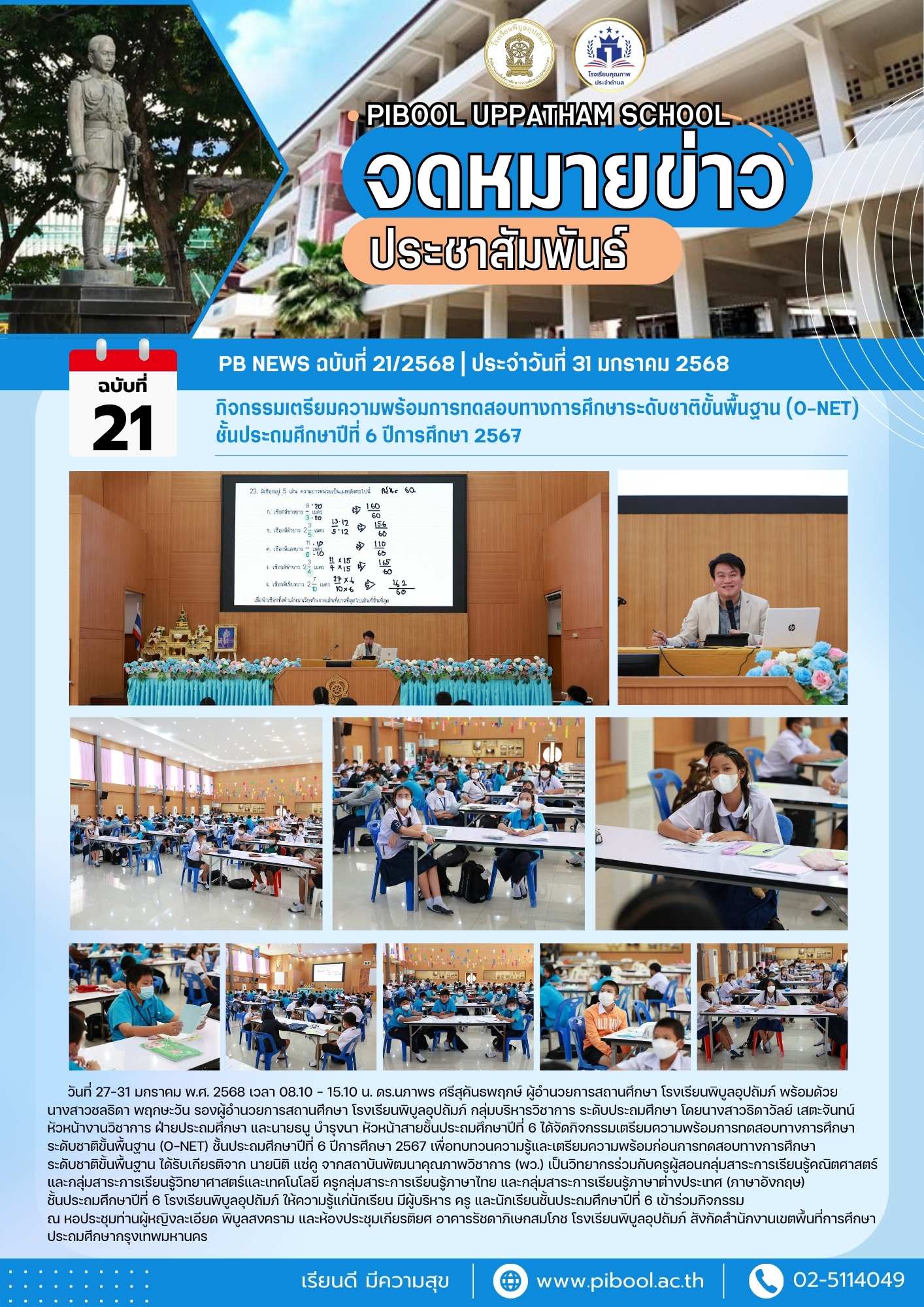 ข่าวประชาสัมพันธ์ ฉบับที่ 21/2568 กิจกรรมเตรียมความพร้อมการทดสอบทางการศึกษาระดับชาติขั้นพื้นฐาน (O-NET) ชั้นประถมศึกษาปีที่ 6 ปีการศึกษา 2567