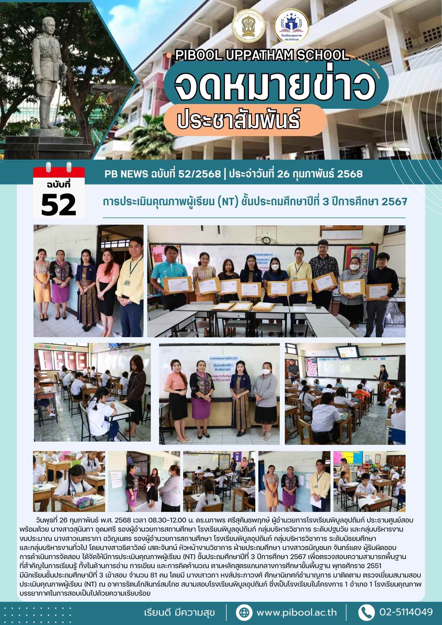 ข่าวประชาสัมพันธ์ ฉบับที่ 52/2568 การประเมินคุณภาพผู้เรียน (NT) ชั้นประถมศึกษาปีที่ 3 ปีการศึกษา 2567
