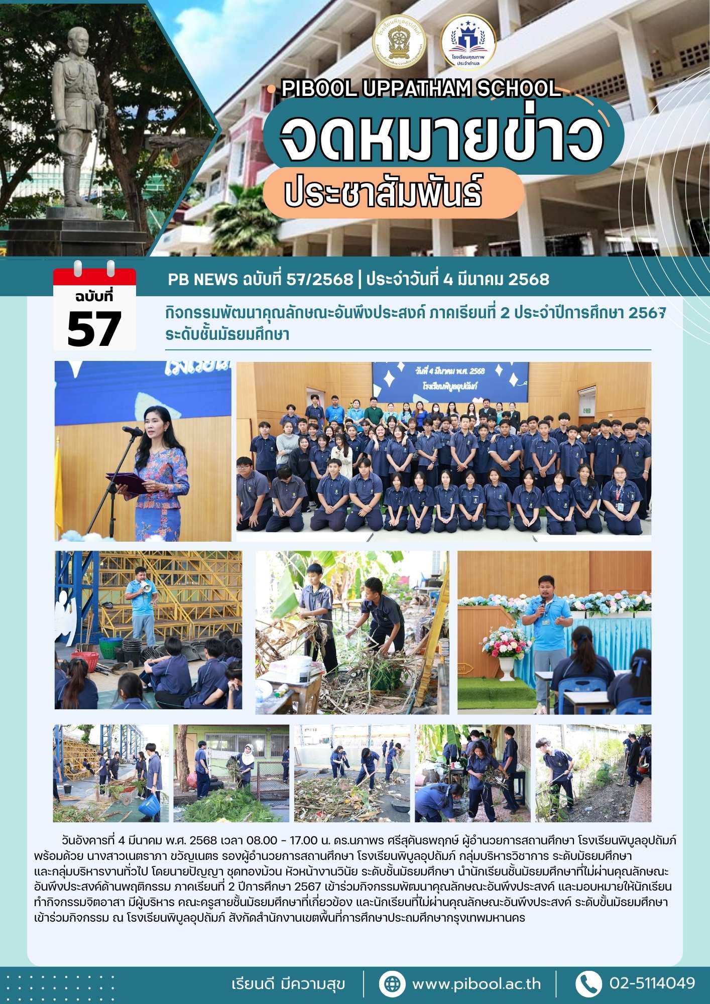 ข่าวประชาสัมพันธ์ ฉบับที่ 57/2568 กิจกรรมพัฒนาคุณลักษณะอันพึงประสงค์ ภาคเรียนที่ 2 ประจำปีการศึกษา 2567 ระดับชั้นมัธยมศึกษา