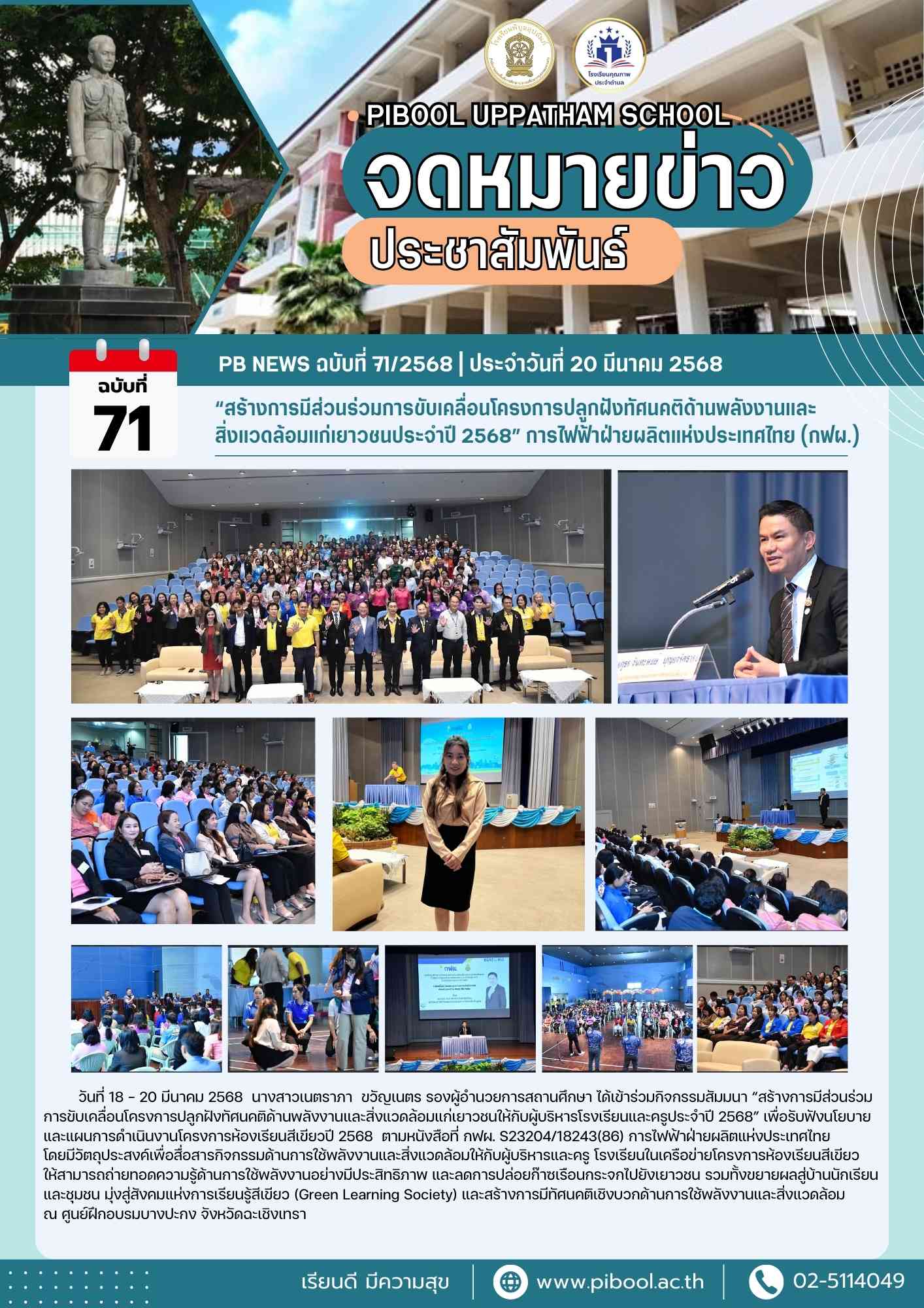 ข่าวประชาสัมพันธ์ ฉบับที่ 71/2568 “สร้างการมีส่วนร่วมการขับเคลื่อนโครงการปลูกฝังทัศนคติด้านพลังงานและ สิ่งแวดล้อมแก่เยาวชนประจำปี 2568” การไฟฟ้าฝ่ายผลิตแห่งประเทศไทย (กฟผ.)