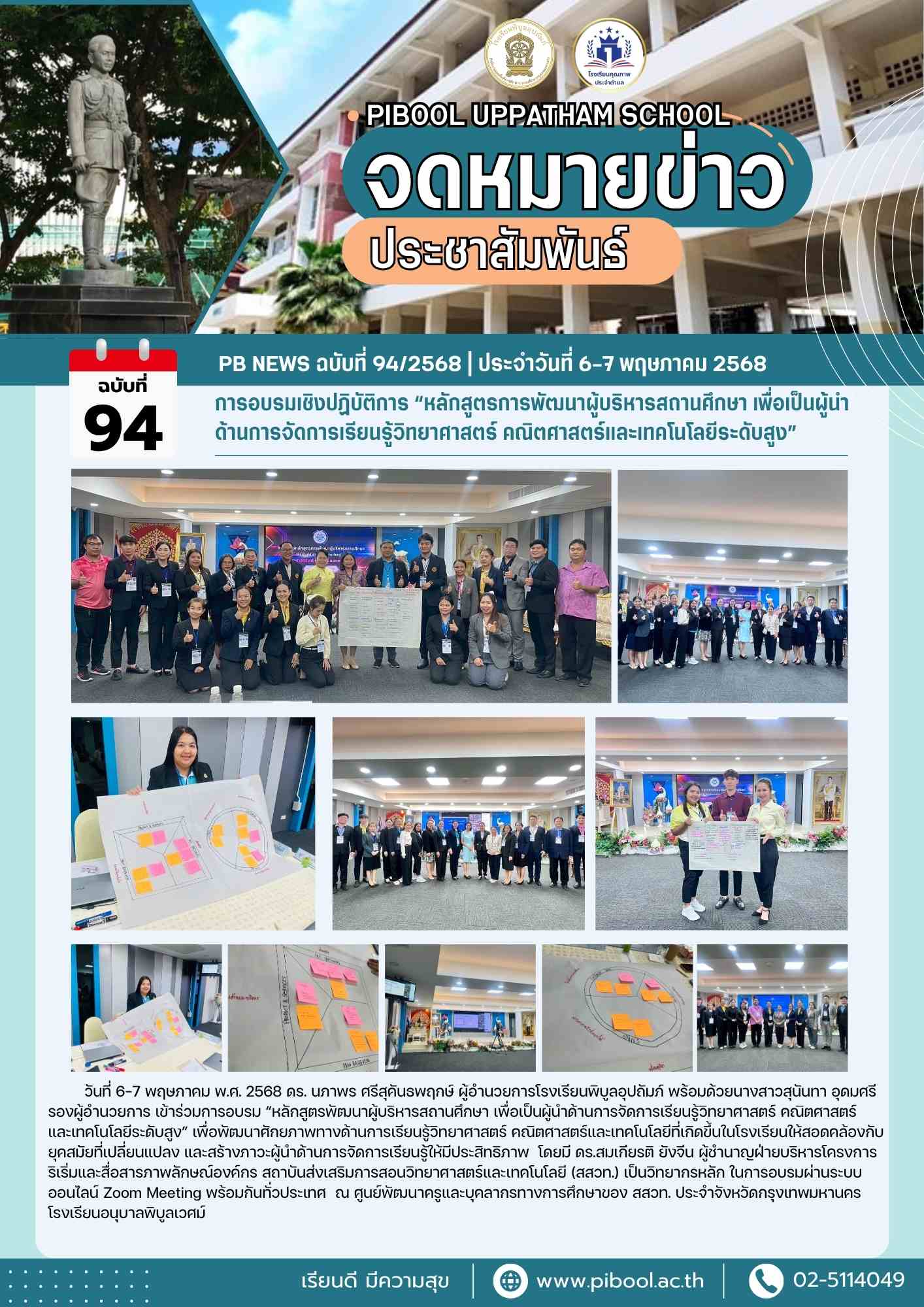 วันที่ 6-7 พฤษภาคม พ.ศ. 2568 ดร. นภาพร ศรีสุคันธพฤกษ์ ผู้อำนวยการโรงเรียนพิบูลอุปถัมภ์ พร้อมด้วยนางสาวสุนันทา อุดมศรี รองผู้อำนวยการ เข้าร่วมการอบรม “หลักสูตรพัฒนาผู้บริหารสถานศึกษา เพื่อเป็นผู้นำด้านการจัดการเรียนรู้วิทยาศาสตร์ คณิตศาสตร์