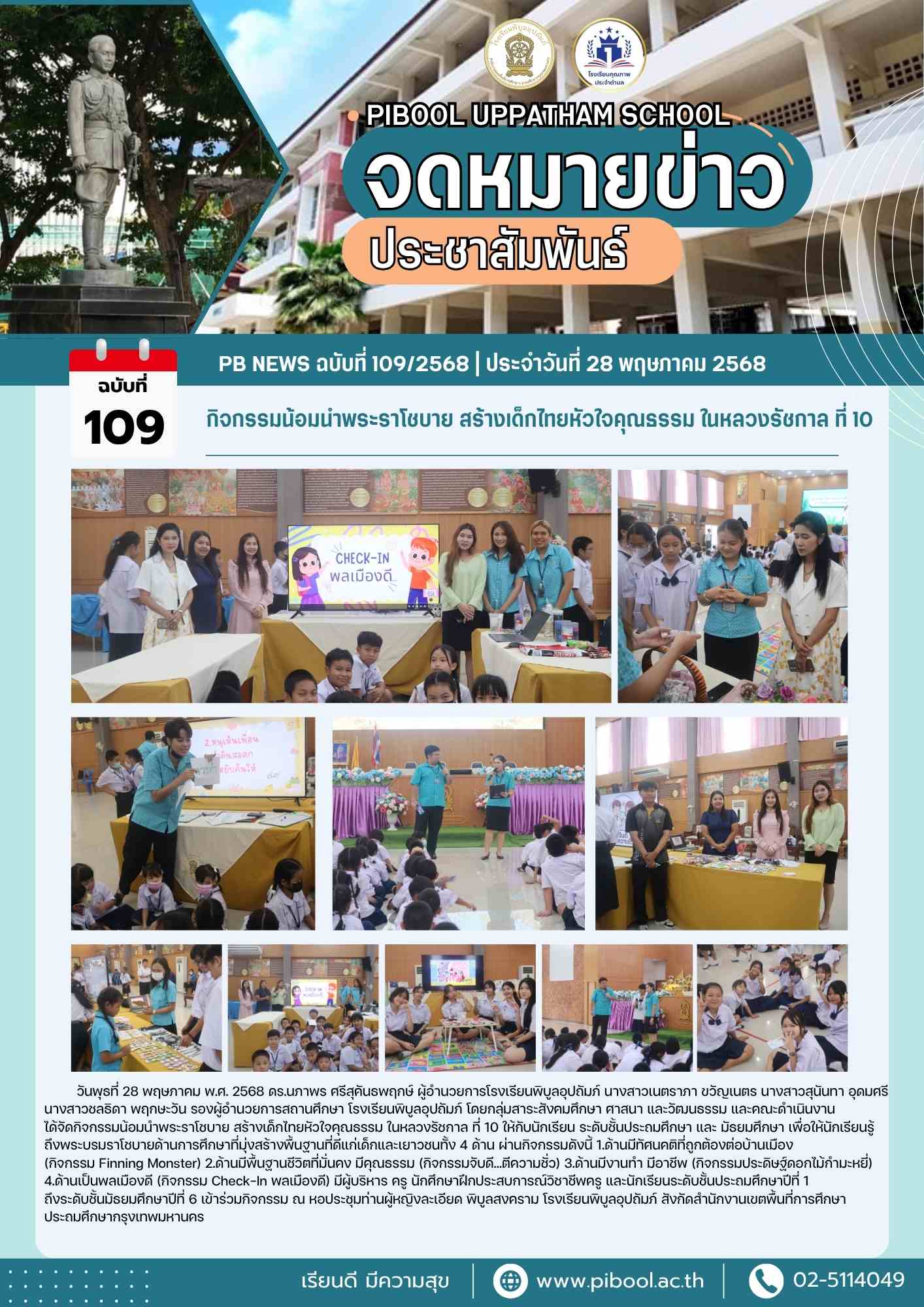 ข่าวประชาสัมพันธ์ ฉบับที่ 109/2568 กิจกรรมน้อมนำพระราโชบาย สร้างเด็กไทยหัวใจคุณธรรม ในหลวงรัชกาล ที่ 10