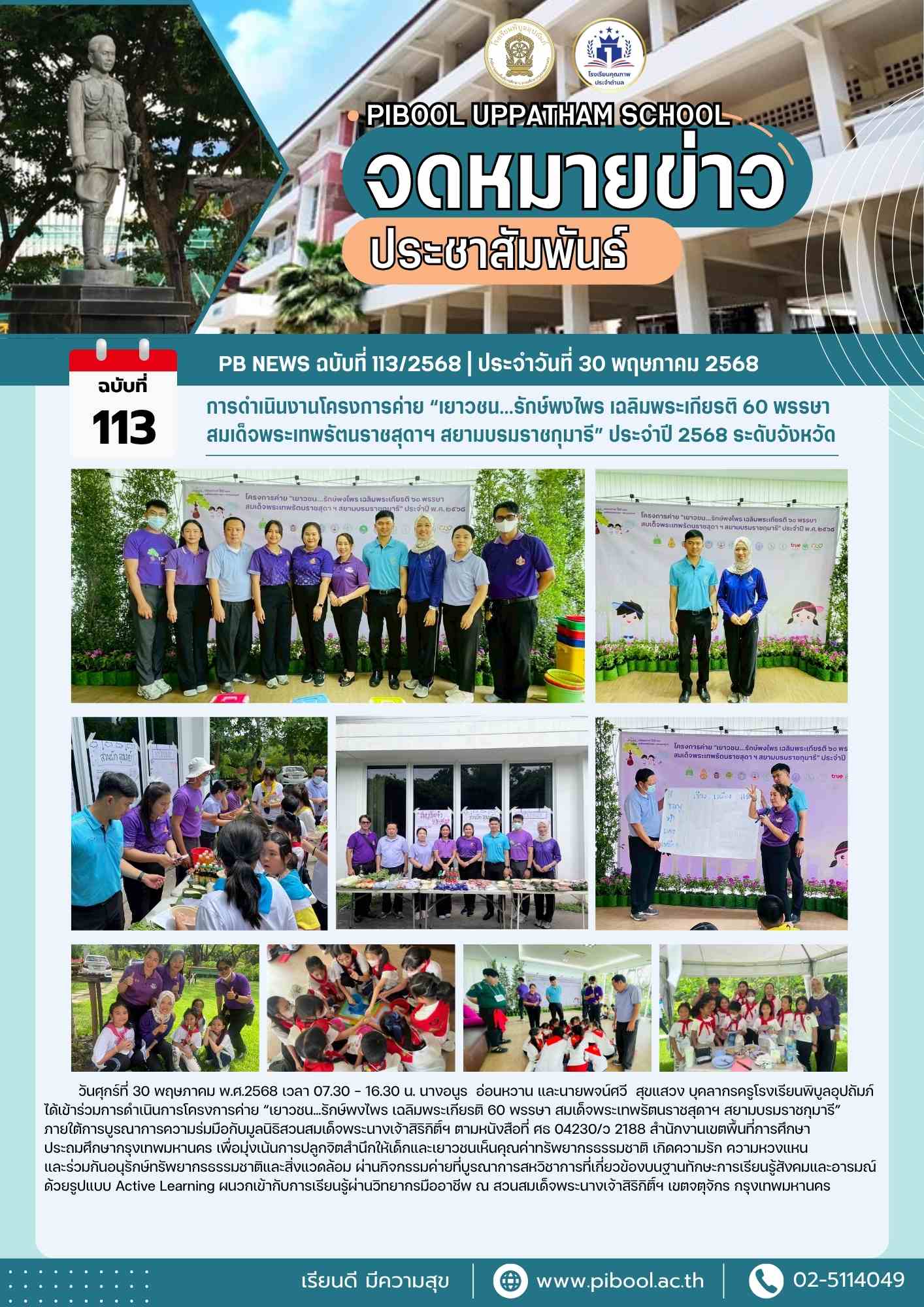 วันศุกร์ที่ 30 พฤษภาคม พ.ศ.2568 เวลา 07.30 – 16.30 น. นางอนูร อ่อนหวาน และนายพจน์ศวี สุขแสวง บุคลากรครูโรงเรียนพิบูลอุปถัมภ์ ได้เข้าร่วมการดำเนินการโครงการค่าย “เยาวชน...รักษ์พงไพร เฉลิมพระเกียรติ 60 พรรษา สมเด็จพระเทพรัตนราชสุดาฯ สยามบรมราชกุมารี”