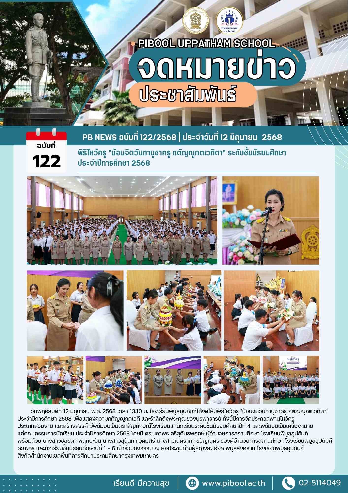 ข่าวประชาสัมพันธ์ ฉบับที่ 122/2568 พิธีไหว้ครู "น้อมจิตวันทาบูชาครู กตัญญูกตเวทิตา" ระดับชั้นมัธยมศึกษา ประจำปีการศึกษา 2568