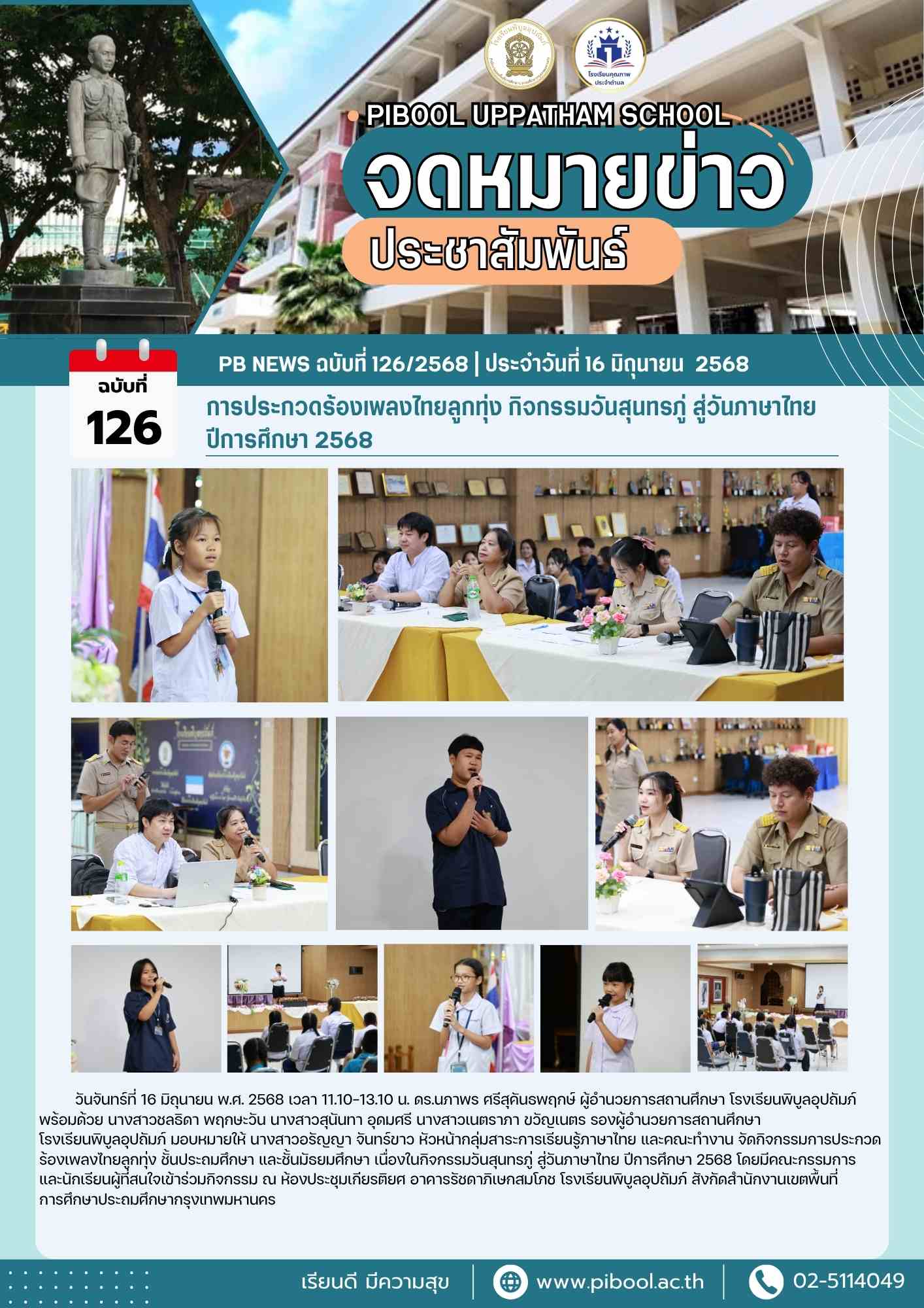 โรงเรียนพิบูลอุปถัมภ์ มอบหมายให้ นางสาวอรัญญา จันทร์ขาว หัวหน้ากลุ่มสาระการเรียนรู้ภาษาไทย และคณะทำงาน จัดกิจกรรมการประกวดร้องเพลงไทยลูกทุ่ง ชั้นประถมศึกษา และชั้นมัธยมศึกษา เนื่องในกิจกรรมวันสุนทรภู่ สู่วันภาษาไทย ปีการศึกษา 2568 โดยมีคณะกรรมการ
