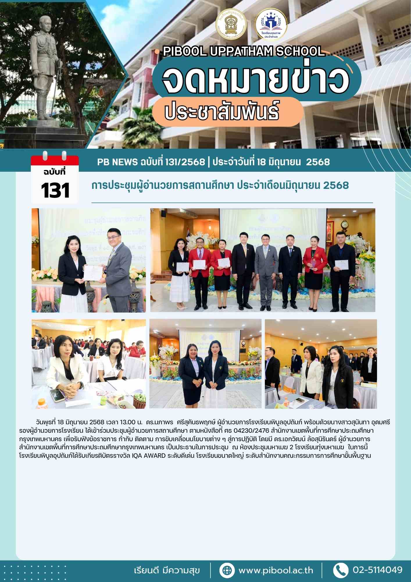 วันพฤหัสบดีที่ 19 มิถุนายน พ.ศ. 2568 ดร.นภาพร ศรีสุคันธพฤกษ์ ผู้อำนวยการสถานศึกษา โรงเรียนพิบูลอุปถัมภ์ พร้อมด้วย นางสาวชลธิดา พฤกษะวัน นางสาวสุนันทา อุดมศรี นางสาวเนตราภา ขวัญเนตร รองผู้อำนวยการสถานศึกษา โรงเรียนพิบูลอุปถัมภ์ นายพิพัฒน์ ทรัพย์มาก และคณะดำเนินงาน จัดกิจกรรมค่ายคุณธรรมจริยธรรม (โรงเรียนวิถีพุทธ) ประจำปีการศึกษา 2568 เพื่อเสริมสร้างคุณธรรม จริยธรรม และพัฒนาคุณลักษณะอันพึงประสงค์แก่นักเรียน