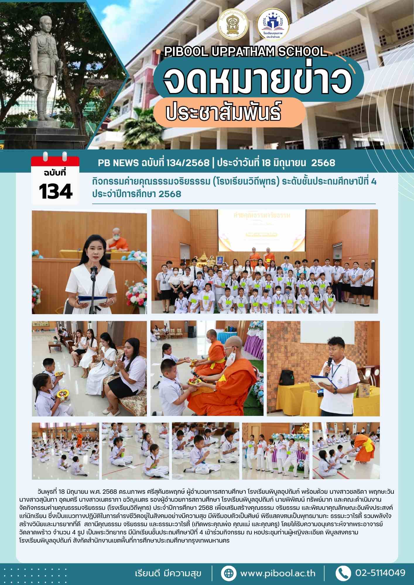 ข่าวประชาสัมพันธ์ ฉบับที่ 134/2568 กิจกรรมค่ายคุณธรรมจริยธรรม (โรงเรียนวิถีพุทธ) ระดับชั้นประถมศึกษาปีที่ 4 ประจำปีการศึกษา 2568
