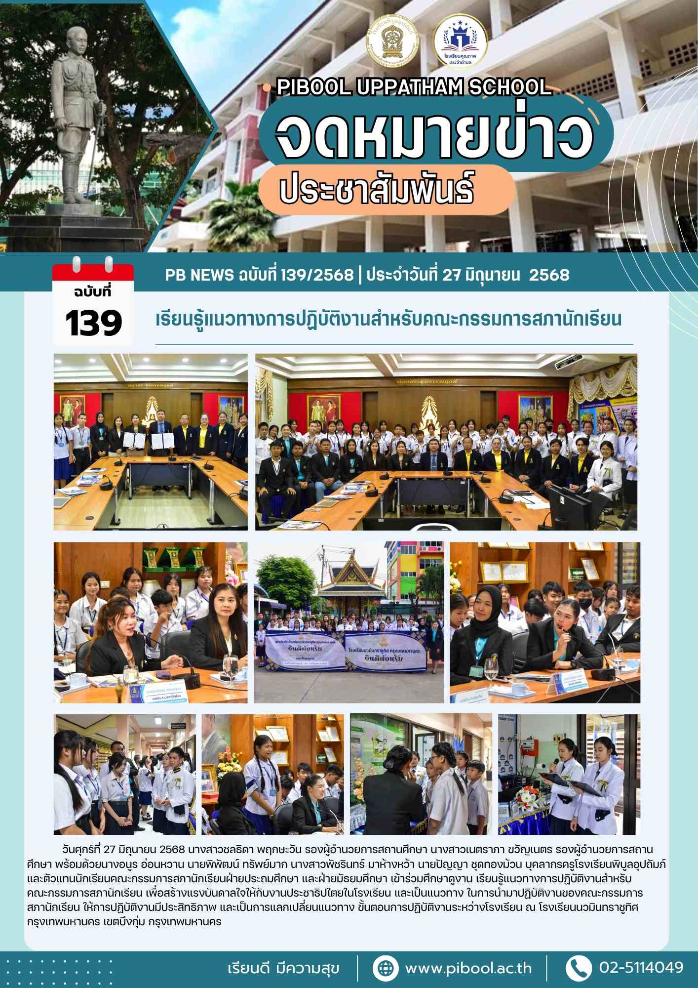 วันศุกร์ที่ 27 มิถุนายน 2568 นางสาวชลธิดา พฤกษะวัน รองผู้อำนวยการสถานศึกษา นางสาวเนตราภา ขวัญเนตร รองผู้อำนวยการสถานศึกษา พร้อมด้วยนางอนูร อ่อนหวาน นายพิพัฒน์ ทรัพย์มาก นางสาวพัชรินทร์ มาห้างหว้า นายปัญญา ชุดทองม้วน บุคลากรครูโรงเรียนพิบูลอุปถัมภ์ และตัวแทนนักเรียนคณะกรรมการสภานักเรียนฝ่ายประถมศึกษา และฝ่ายมัธยมศึกษา เข้าร่วมศึกษาดูงาน เรียนรู้แนวทางการปฏิบัติงานสำหรับ