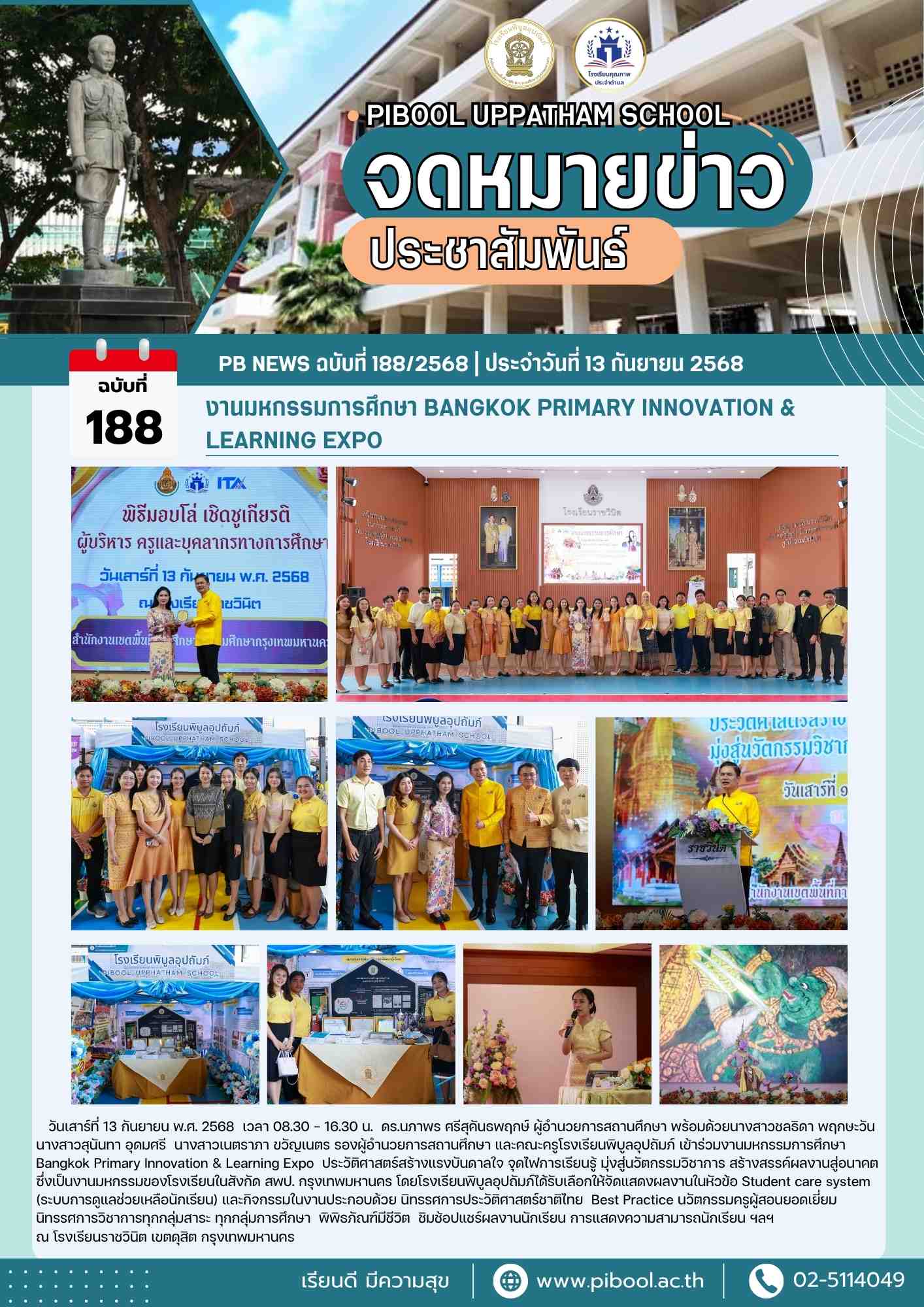 วันเสาร์ที่ 13 กันยายน พ.ศ. 2568 เวลา 08.30 - 16.30 น. ดร.นภาพร ศรีสุคันธพฤกษ์ ผู้อำนวยการสถานศึกษา พร้อมด้วยนางสาวชลธิดา พฤกษะวัน นางสาวสุนันทา อุดมศรี นางสาวเนตราภา ขวัญเนตร รองผู้อำนวยการสถานศึกษา และคณะครูโรงเรียนพิบูลอุปถัมภ์ เข้าร่วมงานมหกรรมการศึกษา Bangkok Primary Innovation & Learning Expo ประวัติศาสตร์สร้างแรงบันดาลใจ จุดไฟการเรียนรู้ มุ่งสู่นวัตกรรมวิชาการ สร้างสรรค์ผลงานสู่อนาคต ซึ่งเป็นงานมหกรรมของโรงเรียนในสังกัด สพป. กรุงเทพมหานคร โดยโรงเรียนพิบูลอุปถัมภ์ได้รับเลือกให้จัดแสดงผลงานในหัวข้อ Student care system (ระบบการดูแลช่วยเหลือนักเรียน) และกิจกรรมในงานประกอบด้วย นิทรรศการประวัติศาสตร์ชาติไทย Best Practice นวัตกรรมครูผู้สอนยอดเยี่ยม นิทรรศการวิชาการทุกกลุ่มสาระ ทุกกลุ่มการศึกษา พิพิธภัณฑ์มีชีวิต ชิมช้อปแชร์ผลงานนักเรียน การแสดงความสามารถนักเรียน ฯลฯ