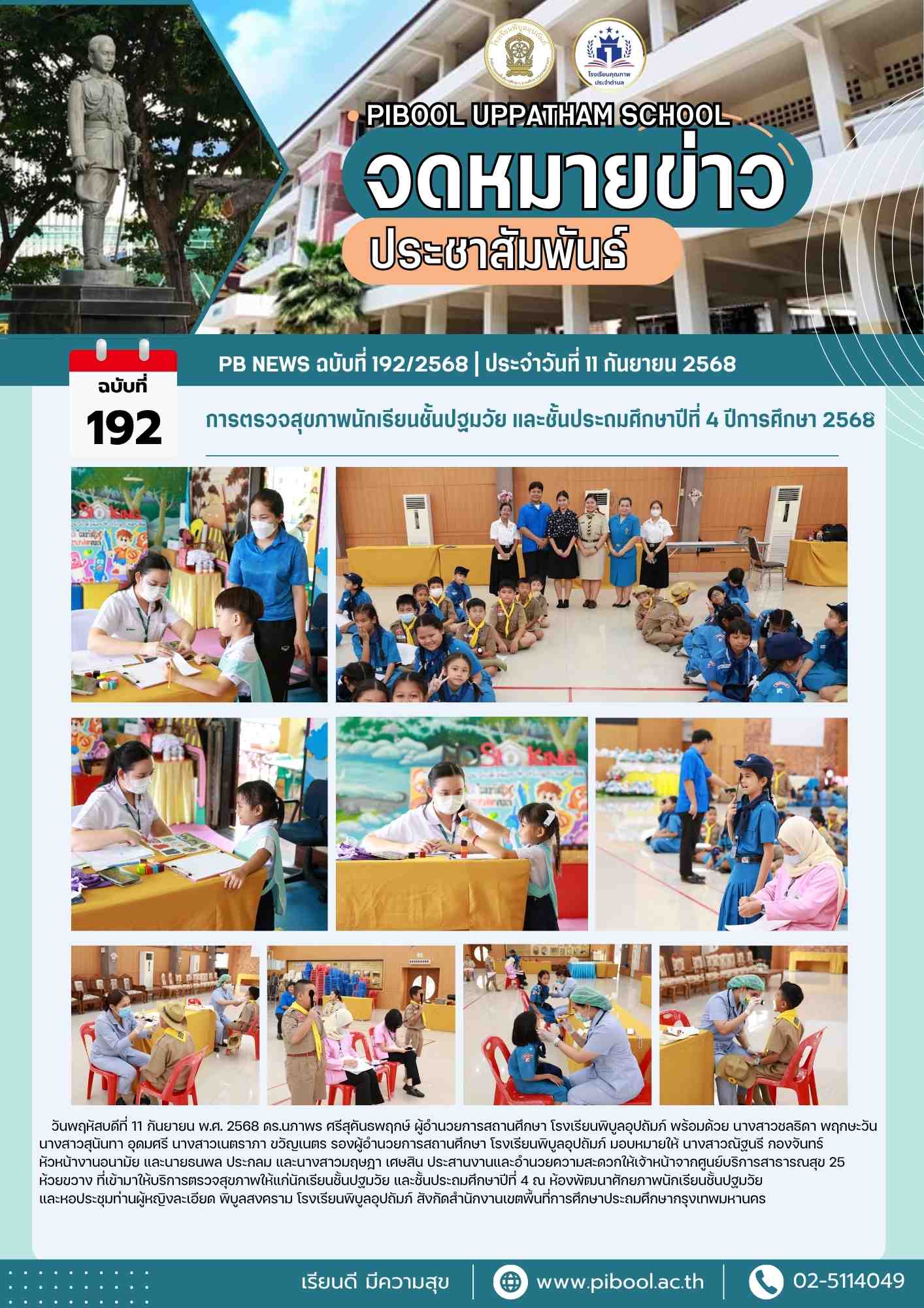 ข่าวประชาสัมพันธ์ ฉบับที่ 192/2568 การตรวจสุขภาพนักเรียนชั้นปฐมวัย และชั้นประถมศึกษาปีที่ 4 ปีการศึกษา 2568