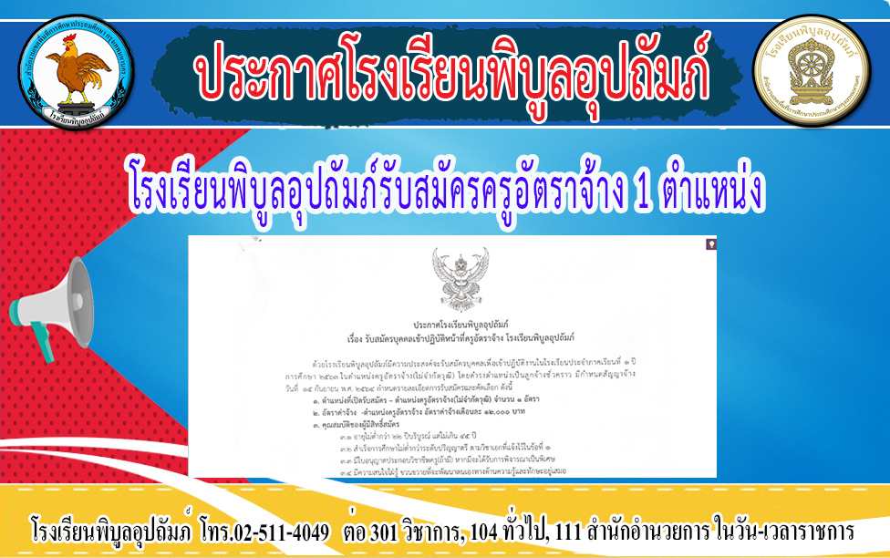 ประกาศรับสมัครครูอัตราจ้าง 1 ตำแหน่ง