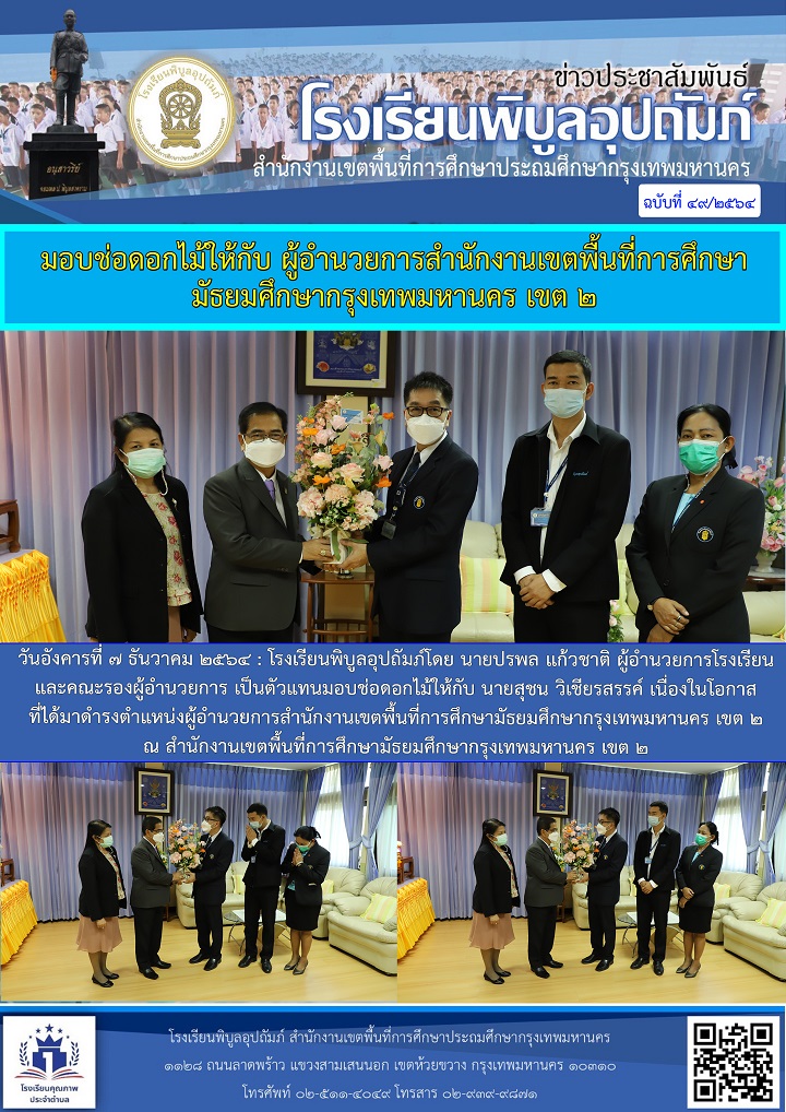จดหมายข่าวฉบับที่ 49/2564 มอบช่อดอกไม้ให้กับ ผู้อำนวยการสำนักงานเขตพื้นที่การศึกษา มัธยมศึกษากรุงเทพมหานคร เขต 2 (7/12/2564)