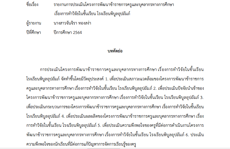 รายงานการประเมินโครงการพัฒนาข้าราชการครูและบุคลากรทางการศึกษา เรื่องการทำวิจัยในชั้นเรียน โรงเรียนพิบูลอุปถัมภ์