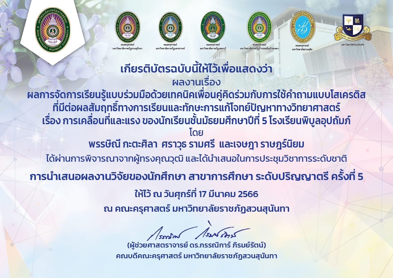 ชื่อผลงาน : ผลการจัดการเรียนรู้แบบร่วมมือด้วยแบบร่วมมือด้วยเทคนิคเพื่อนคู่คิดร่วมกับการใช้คำถามแบบโสเครติสที่มีต่อผลสัมฤทธิ์ทางการเรียนและทักษะการแก้โจทย์ปัญหาทางวิทยาศาสตร์ เรื่อง การเคลื่อนที่และเเรง ของนักเรียนชั้นมัธยมศึกษาปีที่ 5 โรงเรียนพิบูลอุปถัมภ์